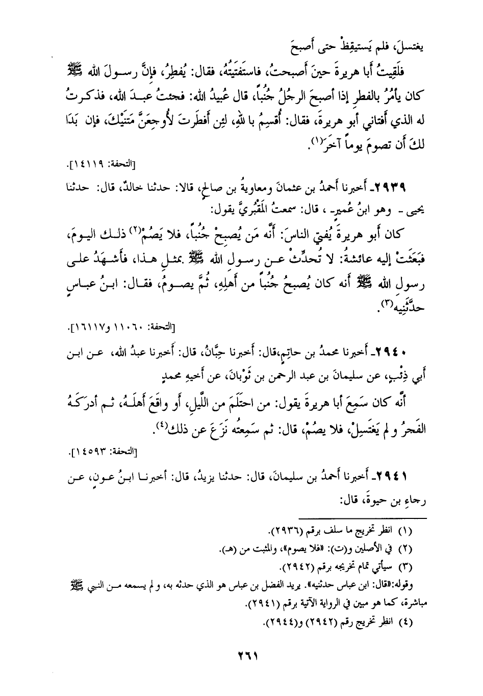 2939 - أَخْبَرَنا أَحْمَدُ بْنُ عُثْمَانَ، وَمُعَاوِيَةُ بْنُ صَالِحٍ، قَالَا: حَدَّثَنَا خَالِدٌ قَالَ: حَدَّثَنَا يَحْيَى وَهُوَ ابْنُ عُمَيْرٍ، قَالَ سَمِعْتُ الْمَقْبُرِيَّ يَقُولُ: كَانَ أَبُو هُرَيْرَةَ، يُفْتِي النَّاسَ أَنَّهُ مَنْ يُصْبِحُ جُنُبًا فَلَا يَصُمْ ذَلِكَ الْيَوْمَ، فَبَعَثَتْ إِلَيْهِ عَائِشَةُ: لَا تُحَدِّثْ عَنْ رَسُولِ اللهِ صَلَّى اللهُ عَلَيْهِ وَسَلَّمَ بِمِثْلِ هَذَا، «§فَأَشْهَدُ عَلَى رَسُولِ اللهِ صَلَّى اللهُ عَلَيْهِ وَسَلَّمَ أَنَّهُ كَانَ يُصْبِحُ جُنُبًا مِنْ أَهْلِهِ ثُمَّ يَصُومُ» فَقَالَ ابْنُ عَبَّاسٍ: حَدَّثَنِيهِ