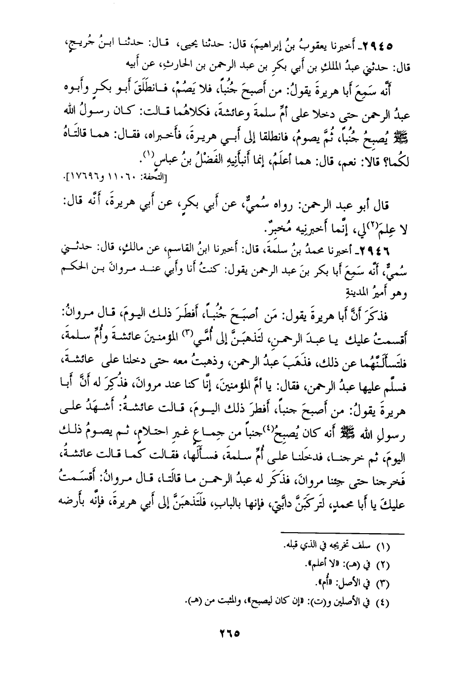 2945 - أَخْبَرَنَا يَعْقُوبُ بْنُ إِبْرَاهِيمَ، قَالَ: حَدَّثَنَا يَحْيَى، قَالَ: حَدَّثَنَا ابْنُ جُرَيْجٍ، قَالَ: حَدَّثَنِي عَبْدُ الْمَلِكِ بْنُ أَبِي بَكْرِ بْنِ عَبْدِ الرَّحْمَنِ بْنِ الْحَارِثِ، عَنْ أَبِيهِ، أَنَّهُ سَمِعَ أَبَا هُرَيْرَةَ، يَقُولُ: مَنْ أَصْبَحَ جُنُبًا، فَلَا يَصُمْ، فَانْطَلَقَ أَبُو بَكْرٍ وَأَبُوهُ عَبْدُ الرَّحْمَنِ حَتَّى دَخَلَا عَلَى أُمِّ سَلَمَةَ وَعَائِشَةَ، فَكِلَاهُمَا قَالَتْ: «§كَانَ رَسُولُ اللهِ صَلَّى اللهُ عَلَيْهِ وَسَلَّمَ يُصْبِحُ جُنُبًا، ثُمَّ يَصُومُ» فَانْطَلَقَا إِلَى أَبِي هُرَيْرَةَ فَأَخْبَرَاهُ فَقَالَ: هُمَا قَالَتَاهُ لَكُمَا؟ قَالَا: نَعَمْ، قَالَ: هُمَا أَعْلَمُ، إِنَّمَا أَنْبَأَنِيهِ الْفَضْلُ بْنُ عَبَّاسٍ قَالَ أَبُو عَبْدِ الرَّحْمَنِ: رَوَاهُ سُمَيٌّ عَنْ أَبِي بَكْرٍ عَنْ أَبِي هُرَيْرَةَ أَنَّهُ قَالَ: لَا عِلْمَ لِي إِنَّمَا أَخْبَرَنِيهِ مُخْبِرٌ