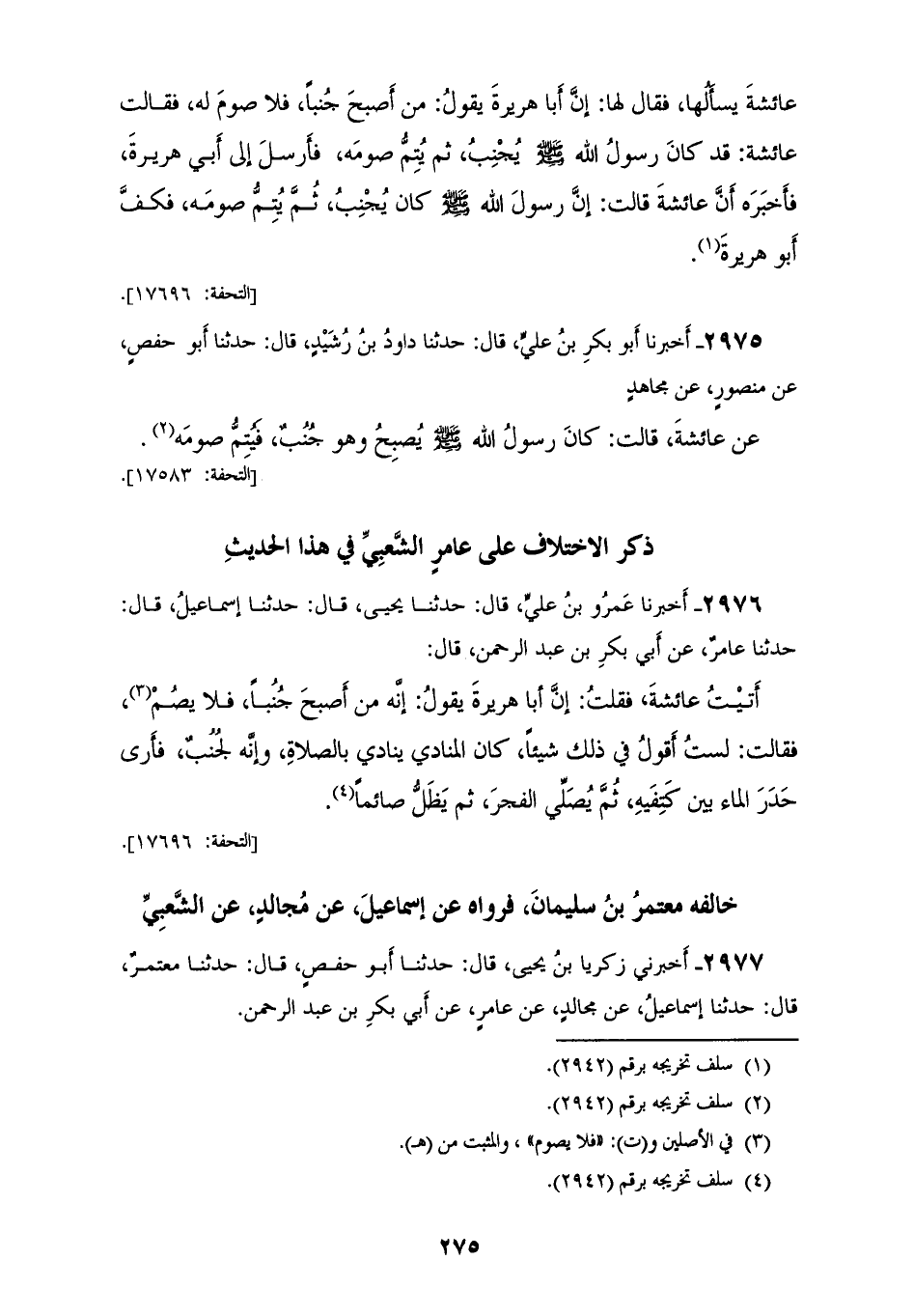 2976 - أَخْبَرَنَا عَمْرُو بْنُ عَلِيٍّ، قَالَ: حَدَّثَنَا يَحْيَى، قَالَ: حَدَّثَنَا إِسْمَاعِيلُ، قَالَ: حَدَّثَنَا عَامِرٌ، عَنْ أَبِي بَكْرِ بْنِ عَبْدِ الرَّحْمَنِ، قَالَ: أَتَيْتُ عَائِشَةَ فَقُلْتُ: إِنَّ أَبَا هُرَيْرَةَ يَقُولُ: إِنَّهُ مَنْ أَصْبَحَ جُنُبًا فَلَا يَصُمْ، فَقَالَتْ: لَسْتُ أَقُولُ فِي ذَلِكَ شَيْئًا «§كَانَ الْمُنَادِي يُنَادِي بِالصَّلَاةِ وَإِنَّهُ لَجُنُبٌ فَأَرَى حَدْرَ الْمَاءِ بَيْنَ كَتِفَيْهِ، ثُمَّ يُصَلِّي الْفَجْرَ، ثُمَّ يَظَلُّ صَائِمًا» خَالَفَهُ مُعْتَمِرُ بْنُ سُلَيْمَانَ فَرَوَاهُ عَنْ إِسْمَاعِيلَ عَنْ مُجَالِدٍ عَنِ الشَّعْبِيِّ