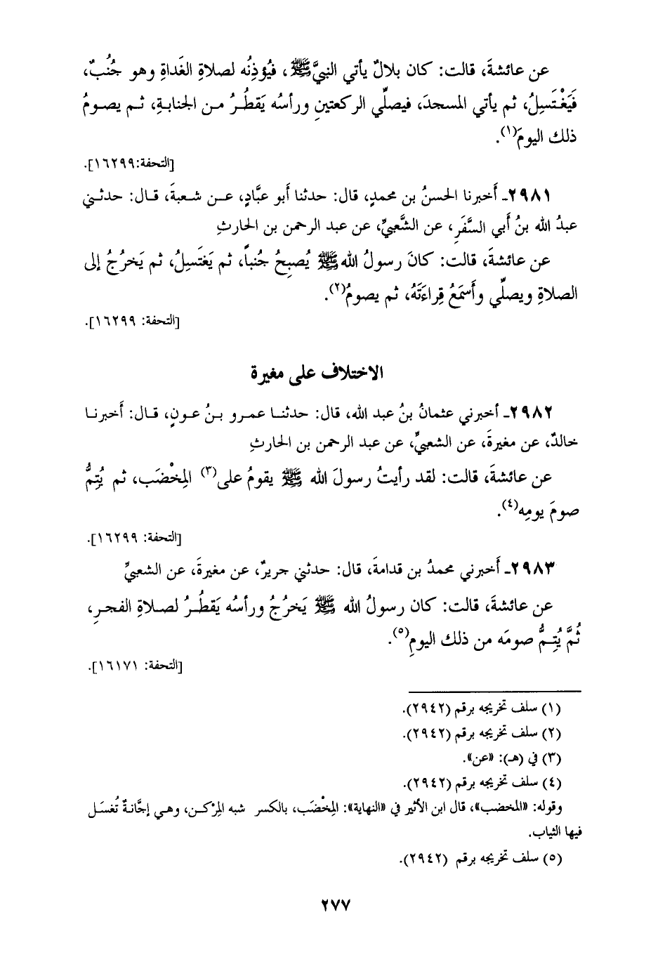 2983 - أَخْبَرَنِي مُحَمَّدُ بْنُ قُدَامَةَ، قَالَ: حَدَّثَنِي جَرِيرٌ، عَنْ مُغِيرَةَ، عَنِ الشَّعْبِيِّ، عَنْ عَائِشَةَ، قَالَتْ: كَانَ رَسُولُ اللهِ صَلَّى اللهُ عَلَيْهِ وَسَلَّمَ «§يَخْرُجُ وَرَأْسُهُ يَقْطُرُ لِصَلَاةِ الْفَجْرِ، ثُمَّ يُتِمُّ صَوْمَهُ ذَلِكَ الْيَوْمَ»