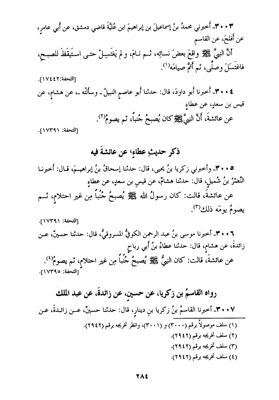 3003 - أَخْبَرَنِي مُحَمَّدُ بْنُ إِسْمَاعِيلَ بْنِ إِبْرَاهِيمَ ابْنِ عُلَيَّةَ، قَاضِي دِمَشْقَ عَنْ أَبِي عَامِرٍ، عَنْ أَفْلَحَ، عَنِ الْقَاسِمِ، أَنَّ النَّبِيَّ صَلَّى اللهُ عَلَيْهِ وَسَلَّمَ «§وَاقَعَ بَعْضُ نِسَائِهِ، ثُمَّ نَامَ وَلَمْ يَغْتَسِلْ حَتَّى اسْتَيْقَظَ لِلصُّبْحِ فَاغْتَسَلَ وَصَلَّى ثُمَّ أَتَمَّ صِيَامَهُ»