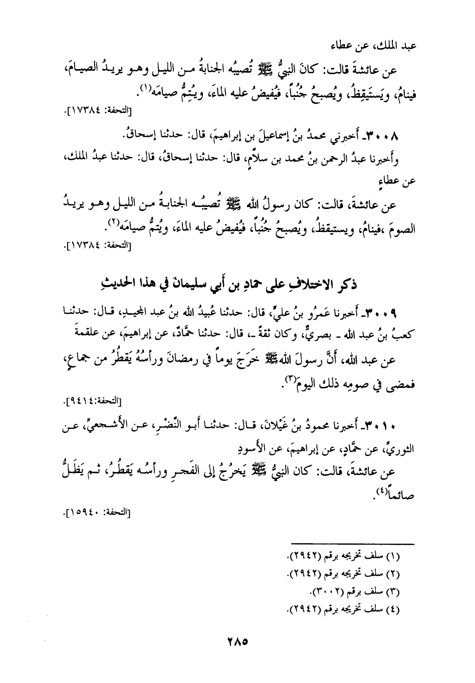 3010 - أَخْبَرَنَا مَحْمُودُ بْنُ غَيْلَانَ، قَالَ: حَدَّثَنَا أَبُو النَّضْرِ، عَنِ الْأَشْجَعِيِّ، عَنِ الثَّوْرِيِّ، عَنْ حَمَّادٍ، عَنْ إِبْرَاهِيمَ، عَنِ الْأَسْوَدِ، عَنْ عَائِشَةَ، قَالَتْ: كَانَ النَّبِيُّ صَلَّى اللهُ عَلَيْهِ وَسَلَّمَ «§يَخْرُجُ إِلَى الْفَجْرِ وَرَأْسُهُ يَقْطُرُ، ثُمَّ يَظَلُّ صَائِمًا» قَالَ أَبُو عَبْدِ الرَّحْمَنِ: «هَذَا أَوْلَى بِالصَّوَابِ مِنْ حَدِيثِ كَعْبٍ، وَكَعْبُ بْنُ عَبْدِ اللهِ، فَلَا نَعْرِفُهُ، وَحَدِيثُهُ خَطَأٌ. وَزَائِدَةُ أَثْبَتُ مِنْ أَبِي عَاصِمٍ وَمِنَ النَّضْرِ، وَحَدِيثُ النَّضْرِ أَوْلَى بِالصَّوَابِ، تَابَعَهُ عَلَى هَذِهِ الرِّوَايَةِ مُغِيرَةُ بْنُ مِقْسَمٍ»