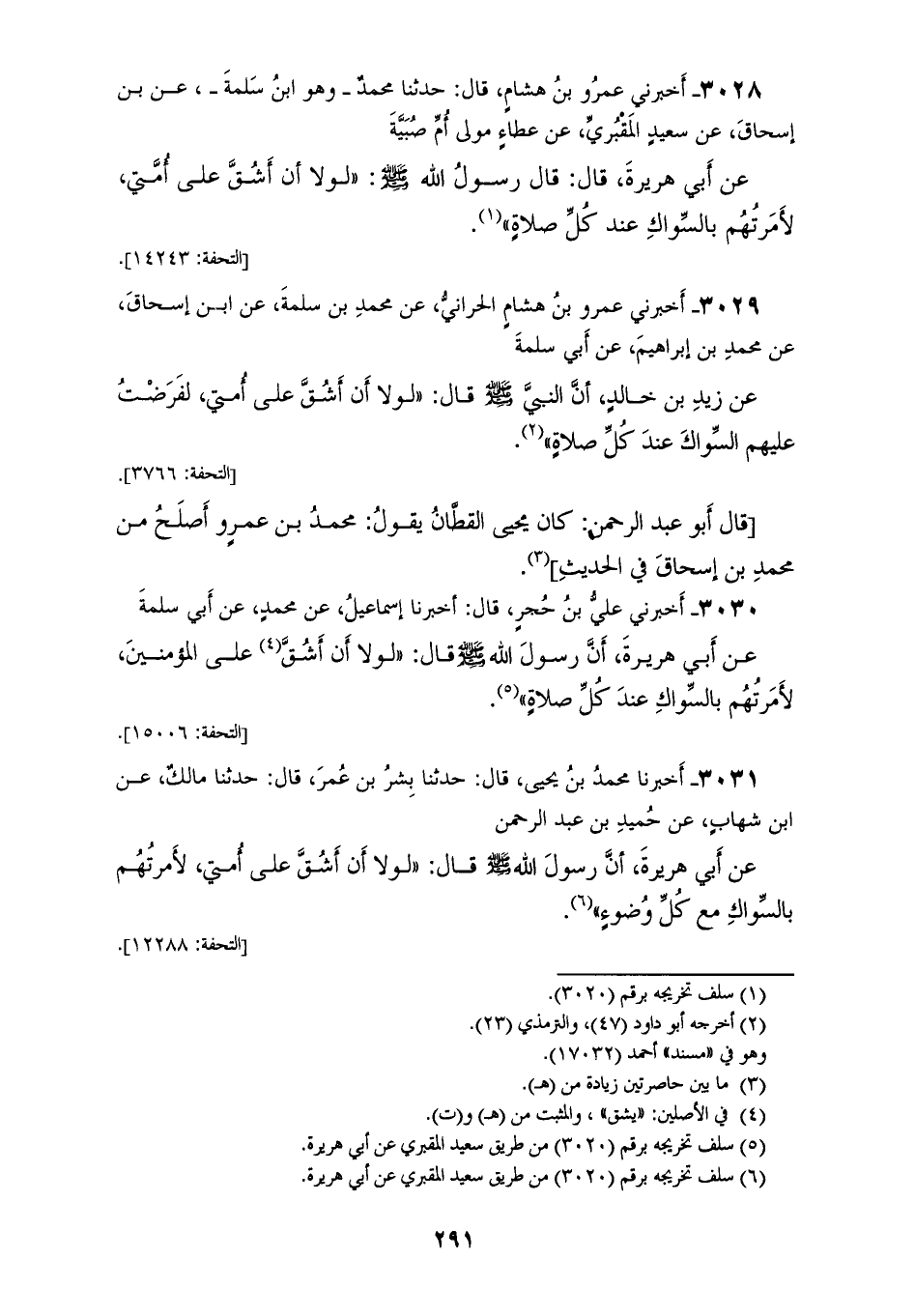 3029 - أَخْبَرَنِي عَمْرُو بْنُ هِشَامٍ الْحَرَّانِيُّ، عَنْ مُحَمَّدِ بْنِ سَلَمَةَ، عَنِ ابْنِ إِسْحَاقَ، عَنْ مُحَمَّدِ بْنِ إِبْرَاهِيمَ، عَنْ أَبِي سَلَمَةَ، عَنْ زَيْدِ بْنِ خَالِدٍ، أَنَّ النَّبِيَّ صَلَّى اللهُ عَلَيْهِ وَسَلَّمَ قَالَ: «§لَوْلَا أَنْ أَشُقَّ عَلَى أُمَّتِي لَفَرَضْتُ عَلَيْهِمُ السِّوَاكَ عِنْدَ كُلِّ صَلَاةٍ» قَالَ أَبُو عَبْدِ الرَّحْمَنِ: كَانَ يَحْيَى الْقَطَّانُ يَقُولُ: مُحَمَّدُ بْنُ عَمْرٍو أَصْلَحُ مِنْ مُحَمَّدِ بْنِ إِسْحَاقَ فِي الْحَدِيثِ