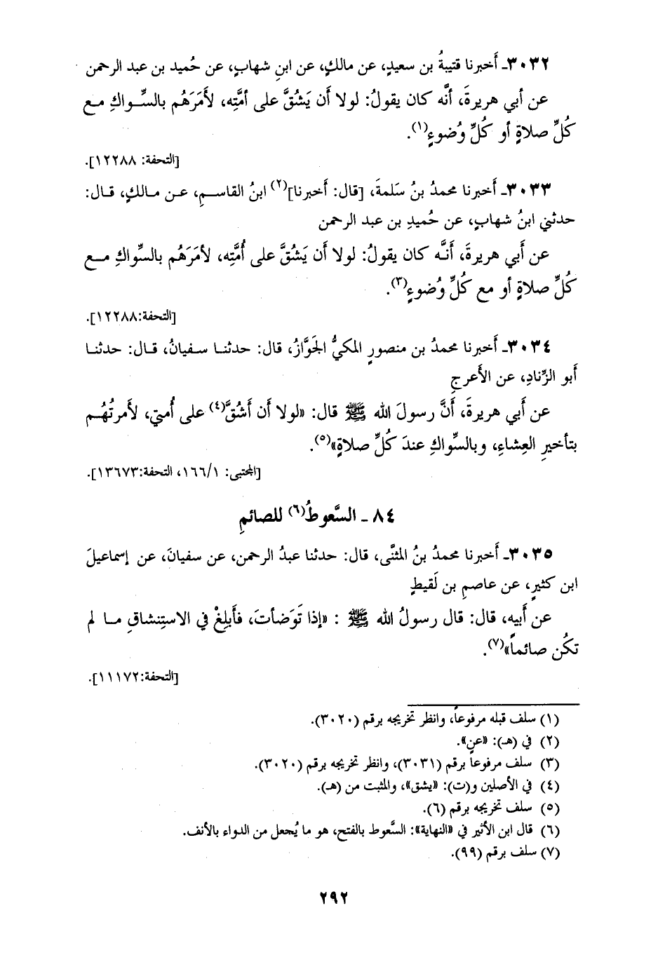 3032 - أَخْبَرَنَا قُتَيْبَةُ بْنُ سَعِيدٍ، عَنْ مَالِكٍ، عَنِ ابْنِ شِهَابٍ، عَنْ حُمَيْدِ بْنِ عَبْدِ الرَّحْمَنِ، عَنْ أَبِي هُرَيْرَةَ أَنَّهُ كَانَ يَقُولُ: «§لَوْلَا أَنْ يُشَقَّ، عَلَى أُمَّتِهِ لَأَمَرَهُمْ بِالسِّوَاكِ مَعَ كُلِّ صَلَاةٍ أَوْ كُلِّ وُضُوءٍ»
