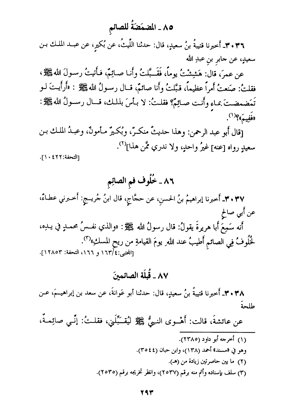 3038 - أَخْبَرَنَا قُتَيْبَةُ بْنُ سَعِيدٍ، قَالَ: حَدَّثَنَا أَبُو عَوَانَةَ، عَنْ سَعْدِ بْنِ إِبْرَاهِيمَ، عَنْ طَلْحَةَ، عَنْ عَائِشَةَ، قَالَتْ: أَهْوَى النَّبِيُّ صَلَّى اللهُ عَلَيْهِ وَسَلَّمَ لِيُقَبِّلَنِي فَقُلْتُ إِنِّي صَائِمَةٌ، فَقَالَ: «§وَأَنَا صَائِمٌ» فَقَبَّلَنِي