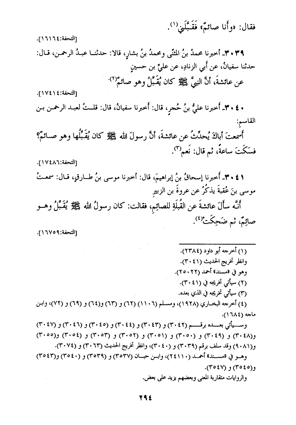 3040 - أَخْبَرَنَا عَلِيُّ بْنُ حُجْرٍ، قَالَ: أَخْبَرَنَا سُفْيَانُ، قَالَ: قُلْتُ لِعَبْدِ الرَّحْمَنِ بْنِ الْقَاسِمِ: أَسَمِعْتَ أَبَاكَ يُحَدِّثُ عَنْ عَائِشَةَ، أَنَّ رَسُولَ اللهِ صَلَّى اللهُ عَلَيْهِ وَسَلَّمَ «§كَانَ يُقَبِّلُهَا وَهُوَ صَائِمٌ؟» فَسَكَتَ سَاعَةً، ثُمَّ قَالَ: نَعَمْ