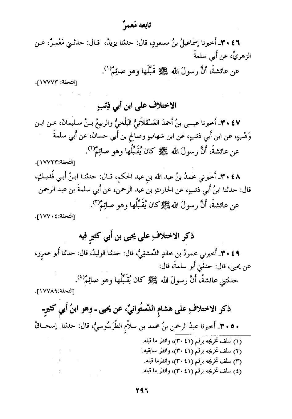 3046 - أَخْبَرَنَا إِسْمَاعِيلُ بْنُ مَسْعُودٍ، قَالَ: حَدَّثَنَا يَزِيدُ، قَالَ: حَدَّثَنِي مَعْمَرٌ، عَنِ الزُّهْرِيِّ، عَنْ أَبِي سَلَمَةَ، عَنْ عَائِشَةَ، أَنَّ رَسُولَ اللهِ صَلَّى اللهُ عَلَيْهِ وَسَلَّمَ «§قَبَّلَهَا وَهُوَ صَائِمٌ»