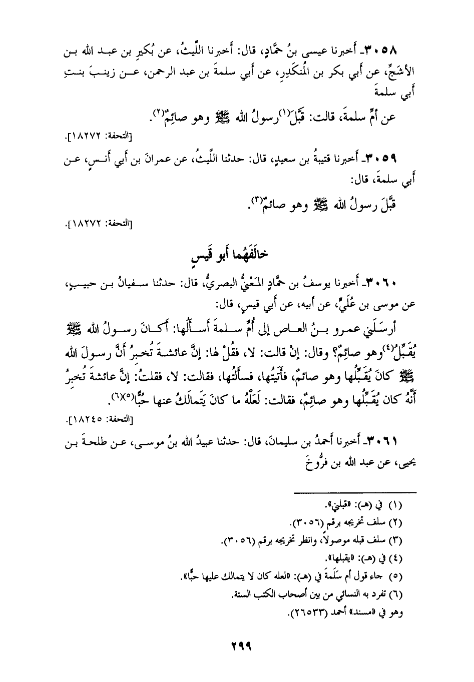 3059 - أَخْبَرَنَا قُتَيْبَةُ بْنُ سَعِيدٍ، قَالَ: حَدَّثَنَا اللَّيْثُ، عَنْ عِمْرَانَ بْنِ أَبِي أَنَسٍ، عَنْ أَبِي سَلَمَةَ، قَالَ: «§قَبَّلَ رَسُولُ اللهِ صَلَّى اللهُ عَلَيْهِ وَسَلَّمَ وَهُوَ صَائِمٌ» خَالَفَهُمَا أَبُو قَيْسٍ