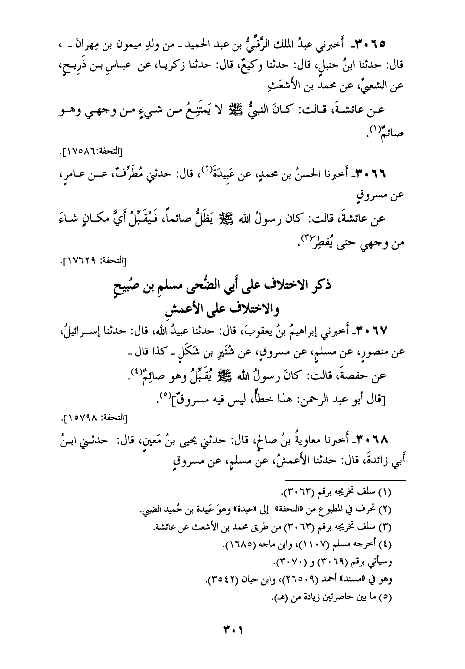 3065 - أَخْبَرَنِي عَبْدُ الْمَلِكِ الرَّقِّيُّ بْنُ عَبْدِ الْحَمِيدِ، مِنْ وَلَدِ مَيْمُونِ بْنِ مِهْرَانَ قَالَ: حَدَّثَنَا ابْنُ حَنْبَلٍ، قَالَ: حَدَّثَنَا وَكِيعٌ، قَالَ: حَدَّثَنَا زَكَرِيَّا، عَنْ عَبَّاسِ بْنِ ذَرِيحٍ، عَنِ الشَّعْبِيِّ، عَنْ مُحَمَّدِ بْنِ الْأَشْعَثِ، عَنْ عَائِشَةَ، قَالَتْ: كَانَ النَّبِيُّ صَلَّى اللهُ عَلَيْهِ وَسَلَّمَ «§لَا يَمْتَنِعُ مِنْ شَيْءٍ مِنْ وَجْهِي وَهُوَ صَائِمٌ»