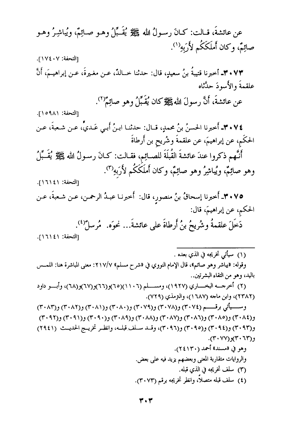 3073 - أَخْبَرَنَا قُتَيْبَةُ بْنُ سَعِيدٍ، قَالَ: حَدَّثَنَا خَالِدٌ، عَنْ مُغِيرَةَ، عَنْ إِبْرَاهِيمَ، أَنَّ عَلْقَمَةَ، وَالْأَسْوَدَ، حَدَّثَاهُ عَنْ عَائِشَةَ، أَنَّ رَسُولَ اللهِ صَلَّى اللهُ عَلَيْهِ وَسَلَّمَ كَانَ «§يُقَبِّلُ وَهُوَ صَائِمٌ»