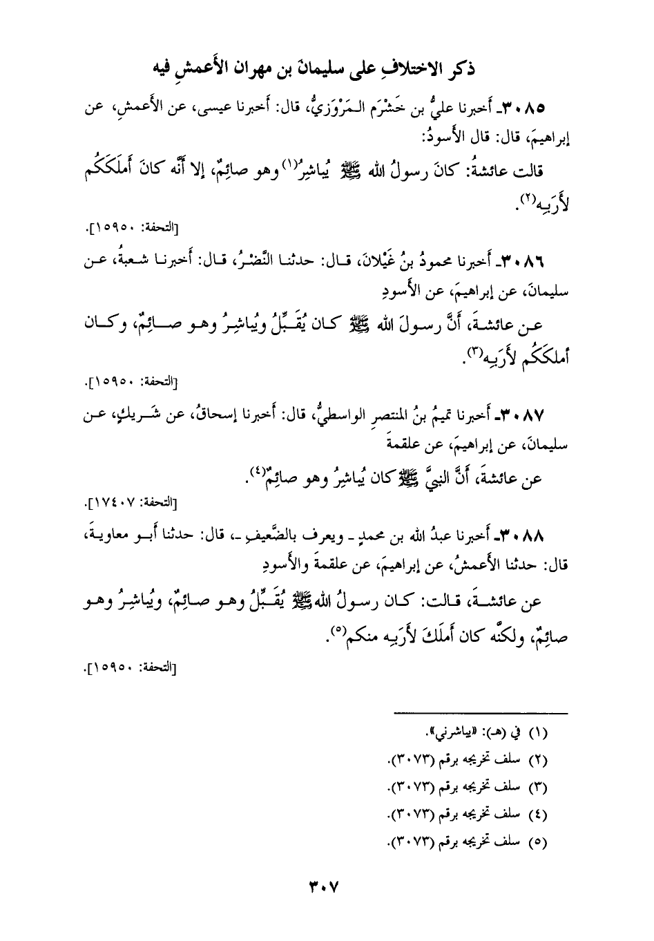 3087 - أَخْبَرَنَا تَمِيمُ بْنُ الْمُنْتَصِرِ الْوَاسِطِيُّ، قَالَ: أَخْبَرَنَا إِسْحَاقُ، عَنْ شَرِيكٍ، عَنْ سُلَيْمَانَ، عَنْ إِبْرَاهِيمَ، عَنْ عَلْقَمَةَ، عَنْ عَائِشَةَ، أَنَّ النَّبِيَّ صَلَّى اللهُ عَلَيْهِ وَسَلَّمَ «§كَانَ يُبَاشِرُ وَهُوَ صَائِمٌ»