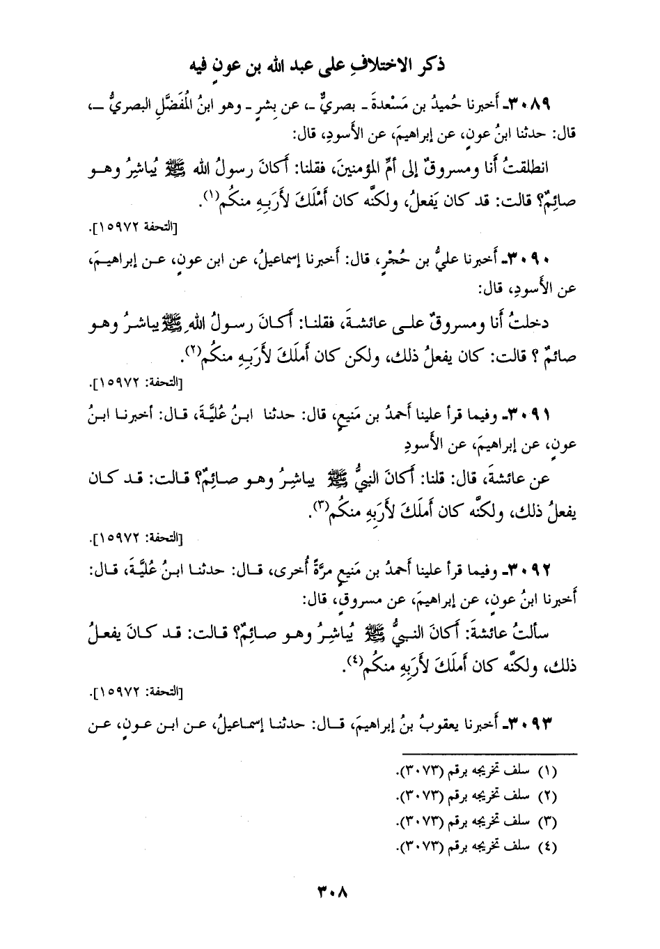 3091 - وَفِيمَا قَرَأَ عَلَيْنَا أَحْمَدُ بْنُ مَنِيعٍ قَالَ: حَدَّثَنَا ابْنُ عُلَيَّةَ، قَالَ: أَخْبَرَنَا ابْنُ عَوْنٍ، عَنْ إِبْرَاهِيمَ، عَنِ الْأَسْوَدِ، عَنْ عَائِشَةَ، قَالَ: قُلْنَا: أَكَانَ النَّبِيُّ صَلَّى اللهُ عَلَيْهِ وَسَلَّمَ يُبَاشِرُ وَهُوَ صَائِمٌ؟ قَالَتْ: «§قَدْ كَانَ يَفْعَلُ ذَلِكَ وَلَكِنَّهُ كَانَ أَمْلَكَ لِإِرْبِهِ مِنْكُمْ»