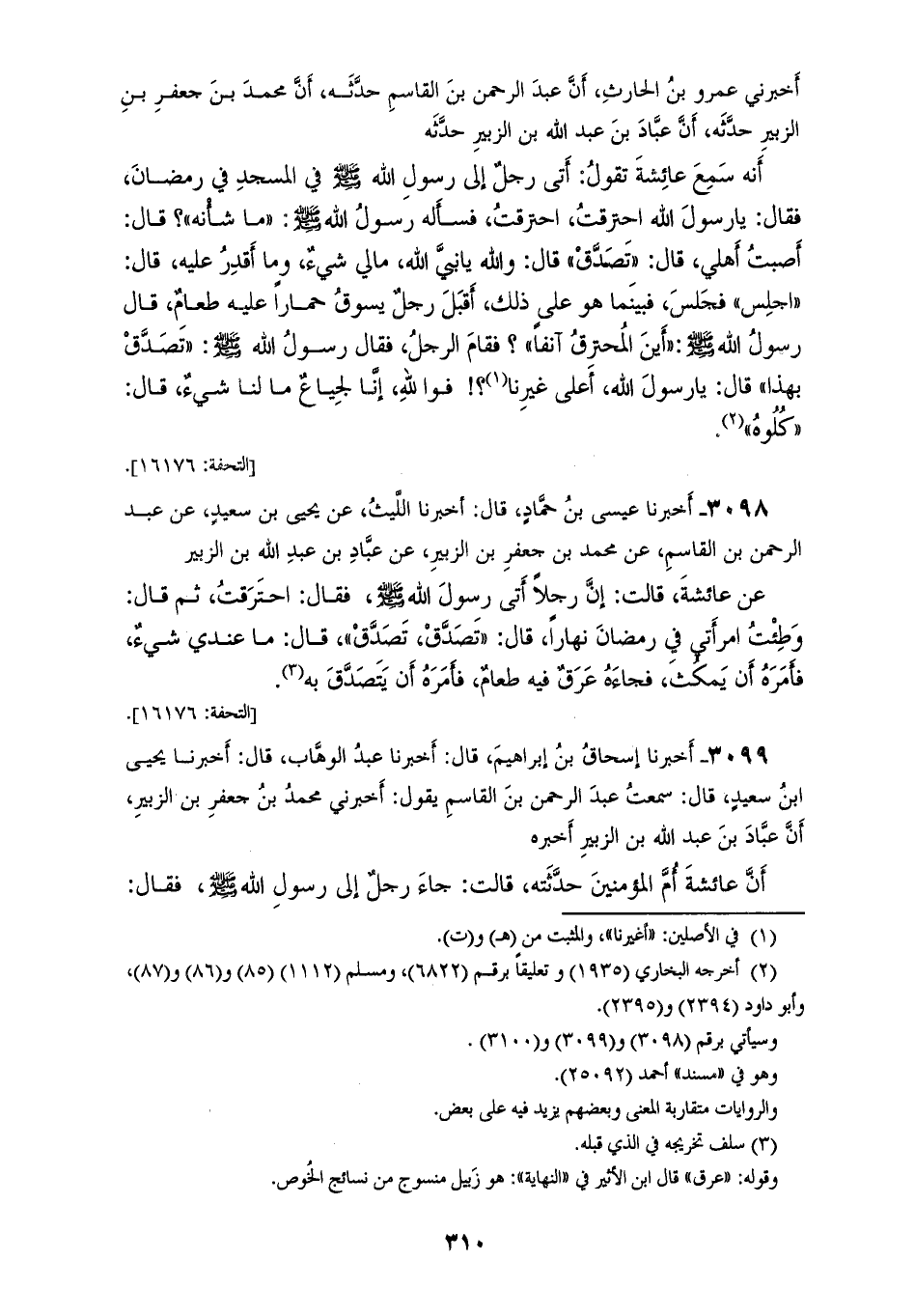 3098 - أَخْبَرَنَا عِيسَى بْنُ حَمَّادٍ، قَالَ: أَخْبَرَنَا اللَّيْثُ، عَنْ يَحْيَى بْنِ سَعِيدٍ، عَنْ عَبْدِ الرَّحْمَنِ بْنِ الْقَاسِمِ، عَنْ مُحَمَّدِ بْنِ جَعْفَرِ بْنِ الزُّبَيْرِ، عَنْ عَبَّادِ بْنِ عَبْدِ اللهِ بْنِ الزُّبَيْرِ، عَنْ عَائِشَةَ، قَالَتْ: إِنَّ رَجُلًا أَتَى رَسُولَ اللهِ صَلَّى اللهُ عَلَيْهِ وَسَلَّمَ فَقَالَ: احْتَرَقْتُ، ثُمَّ قَالَ: وَطِئْتُ امْرَأَتِي فِي رَمَضَانَ نَهَارًا، قَالَ: «تَصَدَّقْ، تَصَدَّقْ» قَالَ: مَا عِنْدِي شَيْءٌ، «§فَأَمَرَهُ أَنْ يَمْكُثَ فَجَاءَهُ عِرْقٌ فِيهِ طَعَامٌ فَأَمَرَهُ أَنْ يَتَصَدَّقَ بِهِ»