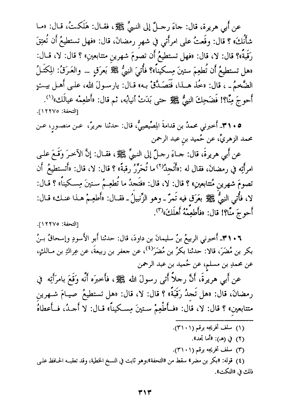 3105 - أَخْبَرَنِي مُحَمَّدُ بْنُ قُدَامَةَ الْمِصِّيصِيُّ، قَالَ: حَدَّثَنَا جَرِيرٌ، عَنْ مَنْصُورٍ، عَنْ مُحَمَّدٍ الزُّهْرِيِّ، عَنْ حُمَيْدِ بْنِ عَبْدِ الرَّحْمَنِ، عَنْ أَبِي هُرَيْرَةَ، قَالَ: جَاءَ رَجُلٌ إِلَى النَّبِيِّ صَلَّى اللهُ عَلَيْهِ وَسَلَّمَ فَقَالَ: إِنَّ الْآخَرَ وَقَعَ عَلَى امْرَأَتِهِ فِي رَمَضَانَ، فَقَالَ لَهُ: «أَتَجِدُ مَا تُحَرِّرُ رَقَبَةً؟» قَالَ: لَا، قَالَ: «أَتَسْتَطِيعُ أَنْ تَصُومَ شَهْرَيْنِ مُتَتَابِعَيْنِ؟» قَالَ: لَا، قَالَ: «فَتَجِدُ مَا تُطْعِمُ سِتِّينَ مِسْكِينًا؟» قَالَ: لَا، فَأُتِيَ النَّبِيُّ صَلَّى اللهُ عَلَيْهِ وَسَلَّمَ بِعَرَقٍ فِيهِ تَمْرٌ وَهُوَ الزَّنْبِيلُ، فَقَالَ: «§أَطْعِمْ هَذَا عَنْكَ» قَالَ: أَحْوَجُ مِنَّا؟ قَالَ: «فَأَطْعِمْهُ أَهْلَكَ»