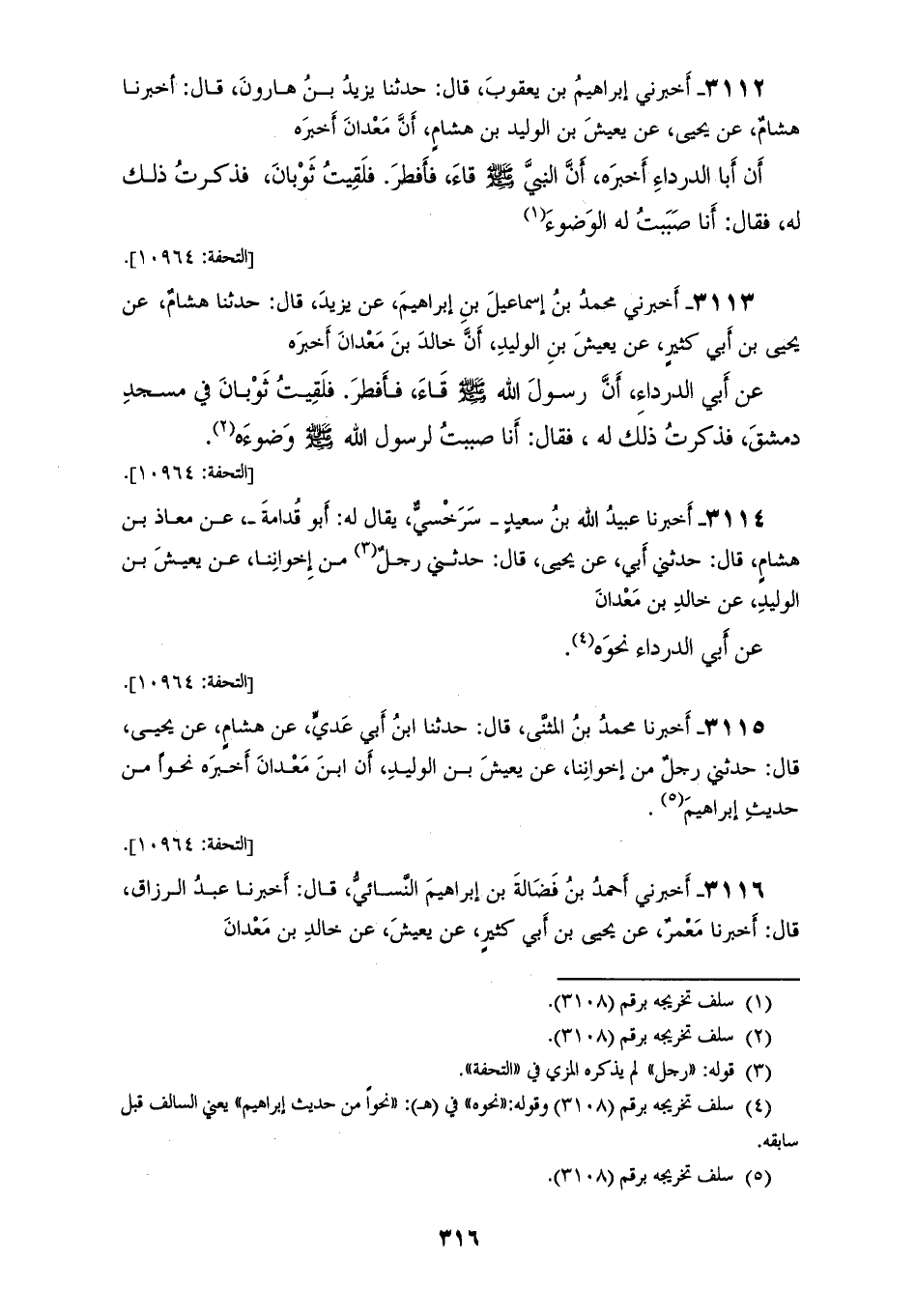3113 - أَخْبَرَنِي مُحَمَّدُ بْنُ إِسْمَاعِيلَ بْنِ إِبْرَاهِيمَ، عَنْ يَزِيدَ، قَالَ: حَدَّثَنَا هِشَامٌ، عَنْ يَحْيَى بْنِ أَبِي كَثِيرٍ، عَنْ يَعِيشَ بْنِ الْوَلِيدِ، أَنَّ خَالِدَ بْنَ مَعْدَانَ، أَخْبَرَهُ، عَنْ أَبِي الدَّرْدَاءِ، أَنَّ رَسُولَ اللهِ صَلَّى اللهُ عَلَيْهِ وَسَلَّمَ «§قَاءَ فَأَفْطَرَ» فَلَقِيتُ ثَوْبَانَ فِي مَسْجِدِ دِمَشْقَ، فَذَكَرْتُ ذَلِكَ لَهُ فَقَالَ: أَنَا صَبَبْتُ لِرَسُولِ اللهِ صَلَّى اللهُ عَلَيْهِ وَسَلَّمَ وُضُوءَهُ