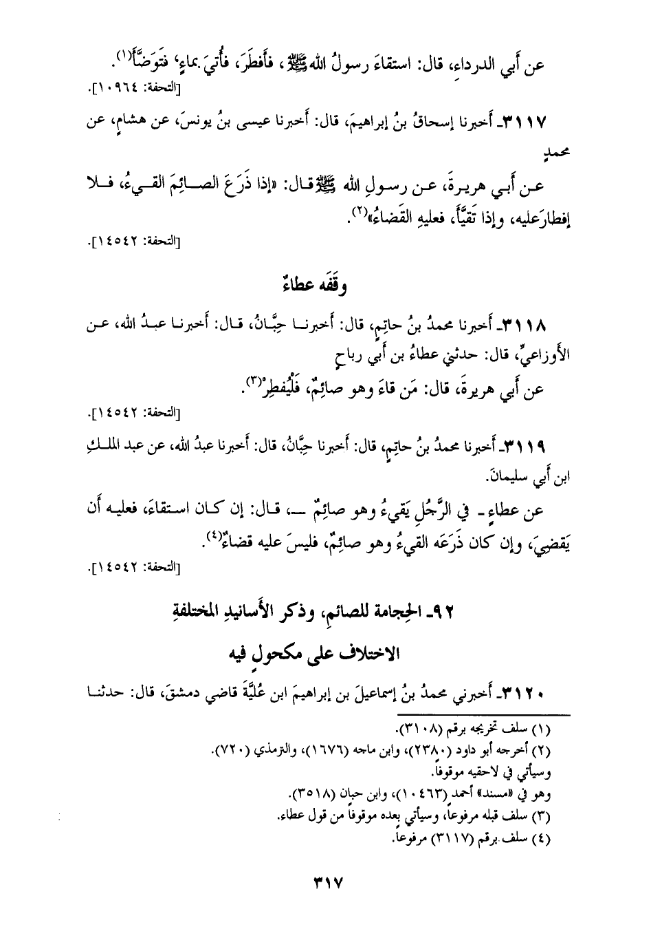 3118 - أَخْبَرَنَا مُحَمَّدُ بْنُ حَاتِمٍ، قَالَ: أَخْبَرَنَا حِبَّانُ، قَالَ: أَخْبَرَنَا عَبْدُ اللهِ عَنِ الْأَوْزَاعِيِّ، قَالَ: حَدَّثَنِي عَطَاءُ بْنُ أَبِي رَبَاحٍ، عَنْ أَبِي هُرَيْرَةَ، قَالَ: «§مَنْ قَاءَ وَهُوَ صَائِمٌ فَلْيُفْطِرْ»