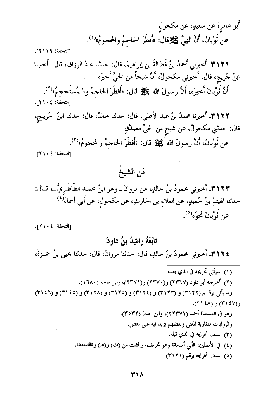 3121 - أَخْبَرَنَي أَحْمَدُ بْنُ فَضَالَةَ بْنِ إِبْرَاهِيمَ، قَالَ: حَدَّثَنَا عَبْدُ الرَّزَّاقِ قَالَ: أَخْبَرَنَا ابْنُ جُرَيْجٍ قَالَ: أَخْبَرَنِي مَكْحُولٌ أَنَّ شَيْخًا، مِنَ الْحَيِّ أَخْبَرَهُ أَنَّ ثَوْبَانَ أَخْبَرَهُ أَنَّ رَسُولَ اللهِ صَلَّى اللهُ عَلَيْهِ وَسَلَّمَ قَالَ: «§أَفْطَرَ الْحَاجِمُ وَالْمُسْتَحِجْمُ»