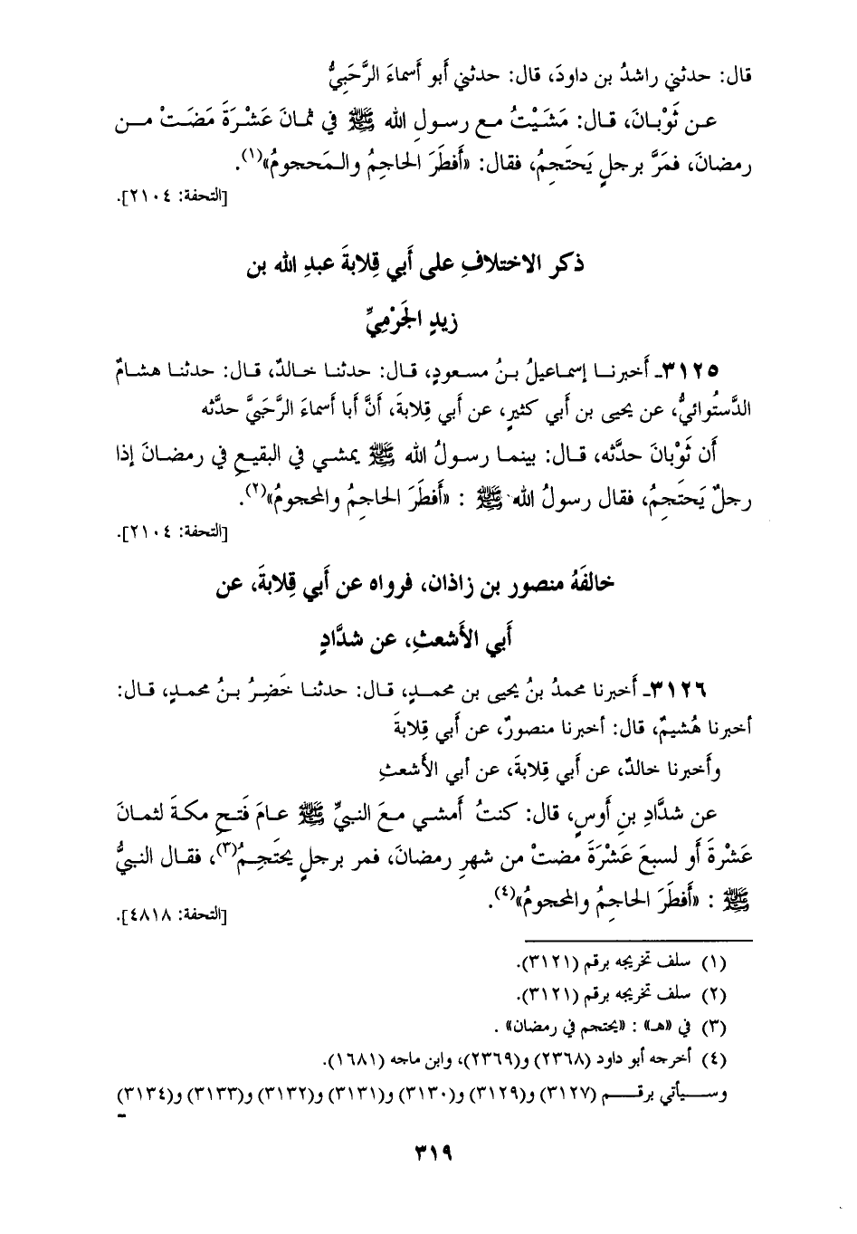 3125 - أَخْبَرَنَا إِسْمَاعِيلُ بْنُ مَسْعُودٍ، قَالَ: حَدَّثَنَا خَالِدٌ، قَالَ: حَدَّثَنَا هِشَامٌ الدَّسْتُوَائِيُّ، عَنْ يَحْيَى بْنِ أَبِي كَثِيرٍ، عَنْ أَبِي قِلَابَةَ، أَنَّ أَبَا أَسْمَاءَ الرَّحَبِيَّ حَدَّثَهُ، أَنَّ ثَوْبَانَ حَدَّثَهُ قَالَ: بَيْنَمَا رَسُولُ اللهِ صَلَّى اللهُ عَلَيْهِ وَسَلَّمَ يَمْشِي فِي الْبَقِيعِ فِي رَمَضَانَ إِذَا رَجُلٌ يَحْتَجِمُ، فَقَالَ رَسُولُ اللهِ صَلَّى اللهُ عَلَيْهِ وَسَلَّمَ: «§أَفْطَرَ الْحَاجِمُ وَالْمَحْجُومُ». خَالَفَهُ مَنْصُورُ بْنُ زَاذَانَ، فَرَوَاهُ عَنْ أَبِي قِلَابَةَ عَنْ أَبِي الْأَشْعَثِ عَنْ شَدَّادٍ