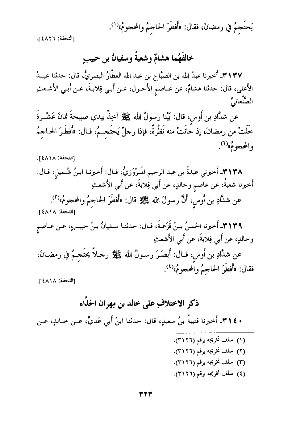 3138 - أَخْبَرَنِي عَبْدَةُ بْنُ عَبْدِ الرَّحِيمِ الْمَرْوَزِيُّ، قَالَ: أَخْبَرَنَا ابْنُ شُمَيْلٍ، قَالَ: أَخْبَرَنَا شُعْبَةُ، عَنْ عَاصِمٍ، وَخَالِدٍ، عَنْ أَبِي قِلَابَةَ، عَنْ أَبِي الْأَشْعَثِ، عَنْ شَدَّادِ بْنِ أَوْسٍ، أَنَّ رَسُولَ اللهِ صَلَّى اللهُ عَلَيْهِ وَسَلَّمَ قَالَ: «§أَفْطَرَ الْحَاجِمُ وَالْمَحْجُومُ»