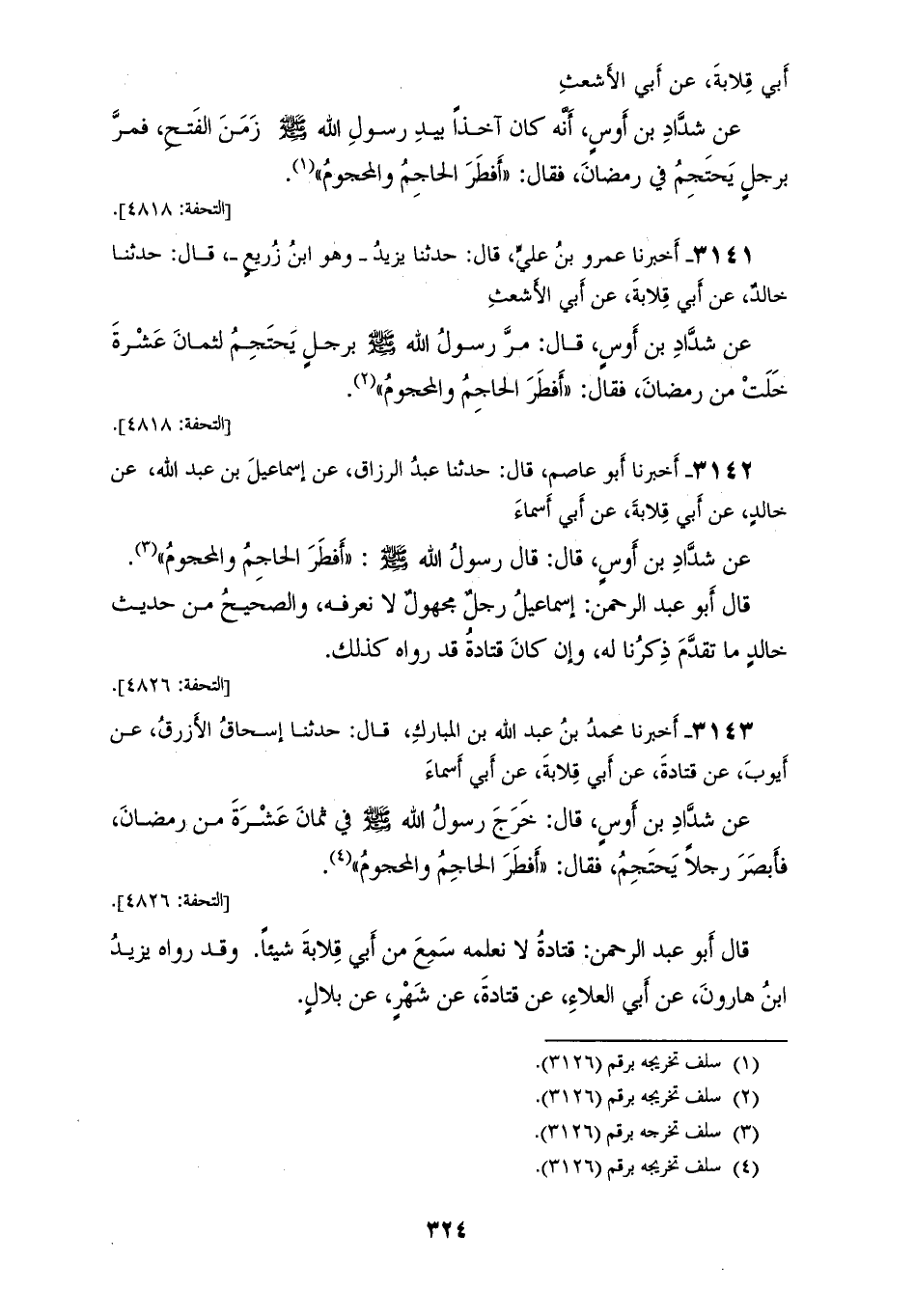 3142 - أَخْبَرَنَا أَبُو عَاصِمٍ، قَالَ: حَدَّثَنَا عَبْدُ الرَّزَّاقِ، عَنْ إِسْمَاعِيلَ بْنِ عَبْدِ اللهِ، عَنْ خَالِدٍ، عَنْ أَبِي قِلَابَةَ، عَنْ أَبِي أَسْمَاءَ، عَنْ شَدَّادِ بْنِ أَوْسٍ، قَالَ: قَالَ رَسُولُ اللهِ صَلَّى اللهُ عَلَيْهِ وَسَلَّمَ: «§أَفْطَرَ الْحَاجِمُ وَالْمَحْجُومُ» قَالَ أَبُو عَبْدِ الرَّحْمَنِ: إِسْمَاعِيلُ رَجُلٌ مَجْهُولٌ لَا نَعْرِفُهُ، وَالصَّحِيحُ مِنْ حَدِيثِ خَالِدٍ مَا تَقَدَّمَ ذِكْرُنَا لَهُ، وَإِنْ كَانَ قَتَادَةُ قَدْ رَوَاهُ كَذَلِكَ