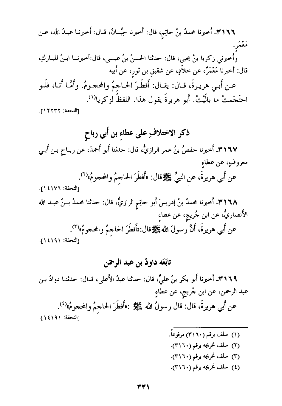 3166 - أَخْبَرَنَا مُحَمَّدُ بْنُ حَاتِمٍ، قَالَ: أَخْبَرَنَا حِبَّانُ، قَالَ: أَخْبَرَنَا عَبْدُ اللهِ، عَنْ مَعْمَرٍ، وَأَخْبَرَنِي زَكَرِيَّا بْنُ يَحْيَى، قَالَ: حَدَّثَنَا الْحَسَنُ بْنُ عِيسَى، قَالَ: أَخْبَرَنَا ابْنُ الْمُبَارَكِ، قَالَ: أَخْبَرَنَا مَعْمَرٌ، عَنْ خَلَّادٍ، عَنْ شَقِيقِ بْنِ ثَوْرٍ، عَنْ أَبِيهِ، عَنْ أَبِي هُرَيْرَةَ، قَالَ: يُقَالُ: «§أَفْطَرَ الْحَاجِمُ وَالْمَحْجُومُ» وَأَمَّا أَنَا فَلَوِ احْتَجَمْتُ مَا بَالَيْتُ أَبُو هُرَيْرَةَ يَقُولُ هَذَا اللَّفْظُ لِزَكَرِيَّا. ذِكْرُ الِاخْتِلَافِ عَلَى عَطَاءِ بْنِ أَبِي رَبَاحٍ