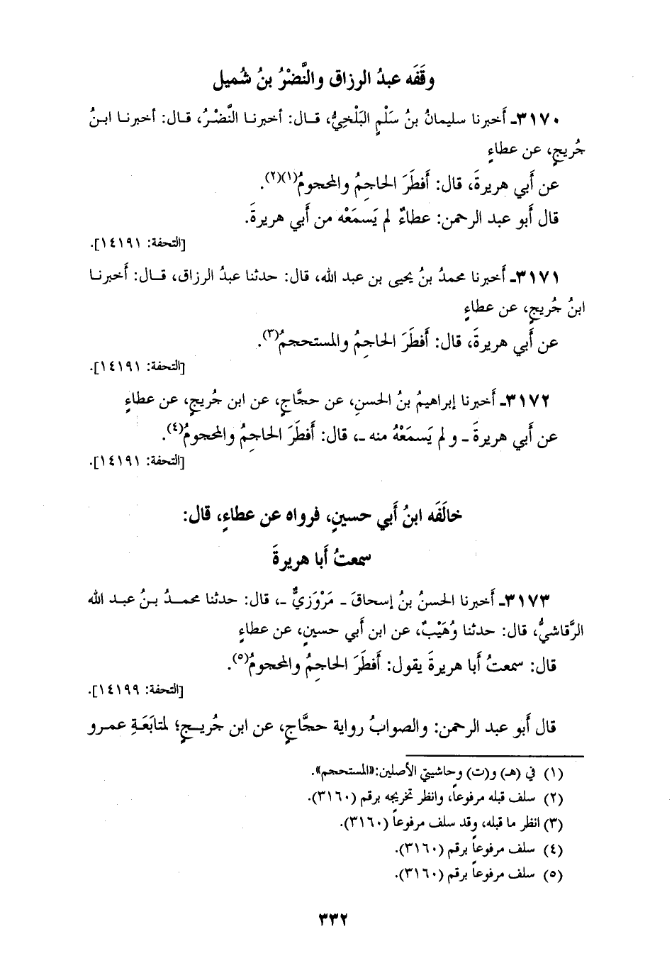 3171 - أَخْبَرَنَا مُحَمَّدُ بْنُ يَحْيَى بْنِ عَبْدِ اللهِ، قَالَ: حَدَّثَنَا عَبْدُ الرَّزَّاقِ، قَالَ: أَخْبَرَنَا ابْنُ جُرَيْجٍ، عَنْ عَطَاءٍ، عَنْ أَبِي هُرَيْرَةَ، قَالَ: «§أَفْطَرَ الْحَاجِمُ وَالْمُسْتَحْجِمُ»