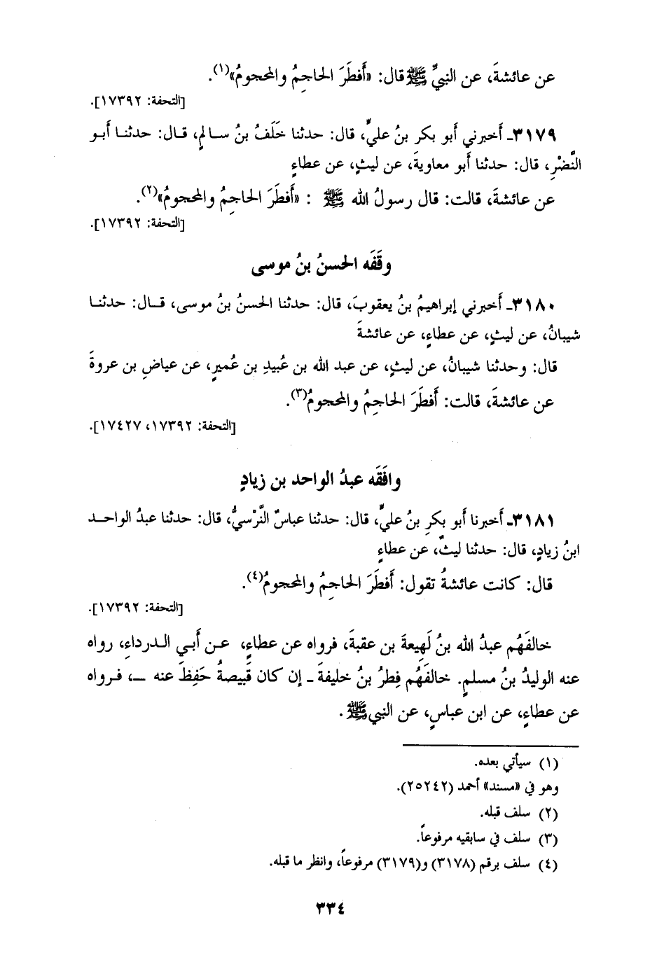 3179 - أَخْبَرَنِي أَبُو بَكْرِ بْنُ عَلِيٍّ، قَالَ: حَدَّثَنَا خَلَفُ بْنُ سَالِمٍ، قَالَ: حَدَّثَنَا أَبُو النَّضْرِ، قَالَ: حَدَّثَنَا أَبُو مُعَاوِيَةَ، عَنْ لَيْثٍ، عَنْ عَطَاءٍ، عَنْ عَائِشَةَ، قَالَتْ: قَالَ رَسُولُ اللهِ صَلَّى اللهُ عَلَيْهِ وَسَلَّمَ: «§أَفْطَرَ الْحَاجِمُ وَالْمَحْجُومُ» وَقَفَهُ الْحَسَنُ بْنُ مُوسَى