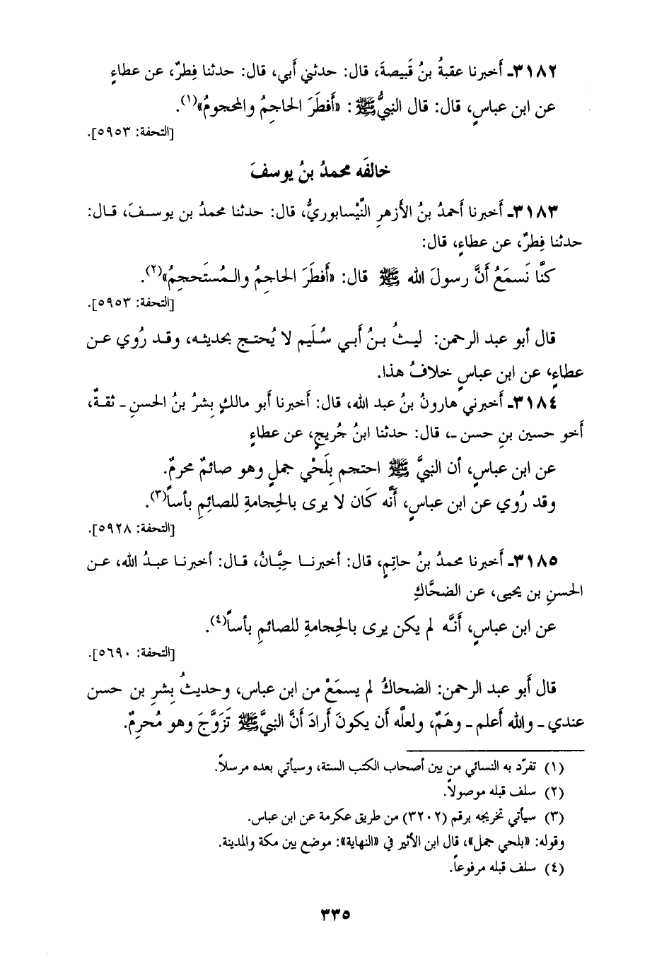 3185 - أَخْبَرَنَا مُحَمَّدُ بْنُ حَاتِمٍ، قَالَ: أَخْبَرَنَا حِبَّانُ، قَالَ: أَخْبَرَنَا عَبْدُ اللهِ، عَنِ الْحَسَنِ بْنِ يَحْيَى، عَنِ الضَّحَّاكِ، عَنِ ابْنِ عَبَّاسٍ، أَنَّهُ «§لَمْ يَكُنْ يَرَى بِالْحِجَامَةِ لِلصَّائِمِ بَأْسًا» قَالَ أَبُو عَبْدِ الرَّحْمَنِ: الضَّحَّاكُ لَمْ يَسْمَعْ مِنَ ابْنِ عَبَّاسٍ وَحَدِيثُ بِشْرِ بْنِ حَسَنٍ عِنْدِي، وَاللهُ أَعْلَمُ وَهْمٌ، وَلَعَلَّهُ أَنْ يَكُونَ أَرَادَ أَنَّ النَّبِيُّ صَلَّى اللهُ عَلَيْهِ وَسَلَّمَ «تَزَوَّجَ وَهُوَ مُحْرِمٌ»