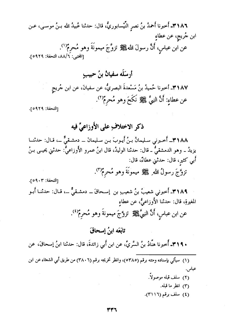 3189 - أَخْبَرَنِي شُعَيْبُ بْنُ شُعَيْبِ بْنِ إِسْحَاقَ، دِمَشْقِيٌّ قَالَ: حَدَّثَنَا أَبُو الْمُغِيرَةِ، قَالَ: حَدَّثَنَا الْأَوْزَاعِيُّ، عَنْ عَطَاءٍ، عَنِ ابْنِ عَبَّاسٍ، أَنَّ النَّبِيَّ صَلَّى اللهُ عَلَيْهِ وَسَلَّمَ «§تَزَوَّجَ مَيْمُونَةَ وَهُوَ مُحْرِمٌ» تَابَعَهُ ابْنُ إِسْحَاقَ