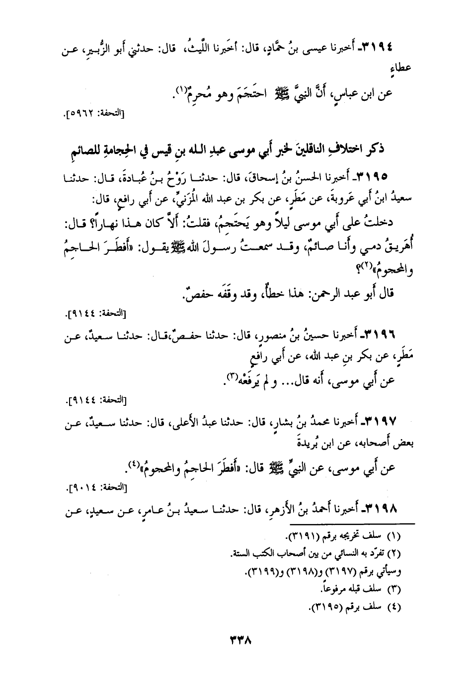 3198 - أَخْبَرَنَا أَحْمَدُ بْنُ الْأَزْهَرِ، قَالَ: حَدَّثَنَا سَعِيدُ بْنُ عَامِرٍ، عَنْ سَعِيدٍ، عَنْ صَاحِبٍ، لَهُ عَنْ عَبْدِ اللهِ بْنِ بُرَيْدَةَ، قَالَ: دُخِلَ عَلَى أَبِي مُوسَى بِلَيْلٍ وَهُوَ يَحْتَجِمُ، فَقِيلَ لَهُ لَوْ كَانَ هَذَا نَهَارًا قَالَ إِنَّ رَسُولَ اللهِ صَلَّى اللهُ عَلَيْهِ وَسَلَّمَ قَالَ: «§أَفْطَرَ الْحَاجِمُ وَالْمَحْجُومُ»