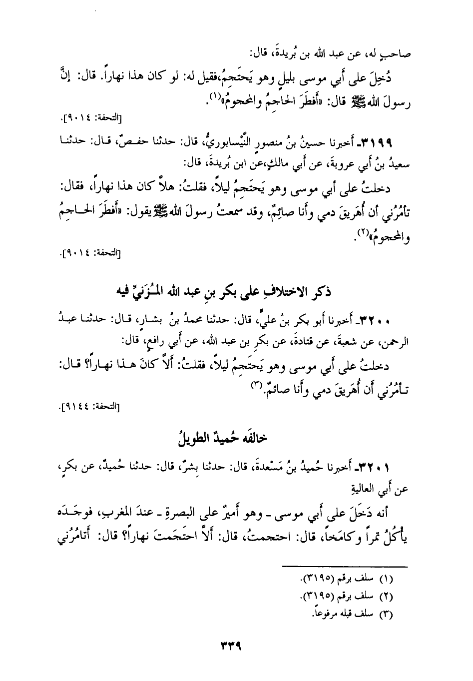 3200 - أَخْبَرَنَا أَبُو بَكْرِ بْنُ عَلِيٍّ، قَالَ: حَدَّثَنَا مُحَمَّدُ بْنُ بَشَّارٍ، قَالَ: حَدَّثَنَا عَبْدُ الرَّحْمَنِ، عَنْ شُعْبَةَ، عَنْ قَتَادَةَ، عَنْ بَكْرِ بْنِ عَبْدِ اللهِ، عَنْ أَبِي رَافِعٍ، قَالَ: دَخَلْتُ عَلَى أَبِي مُوسَى وَهُوَ يَحْتَجِمُ لَيْلًا فَقُلْتُ: أَلَا كَانَ هَذَا نَهَارًا؟ قَالَ: «§تَأْمُرُنِي أَنْ أُهَرِيقَ دَمِي وَأَنَا صَائِمٌ؟» خَالَفَهُ حُمَيْدٌ الطَّوِيلُ