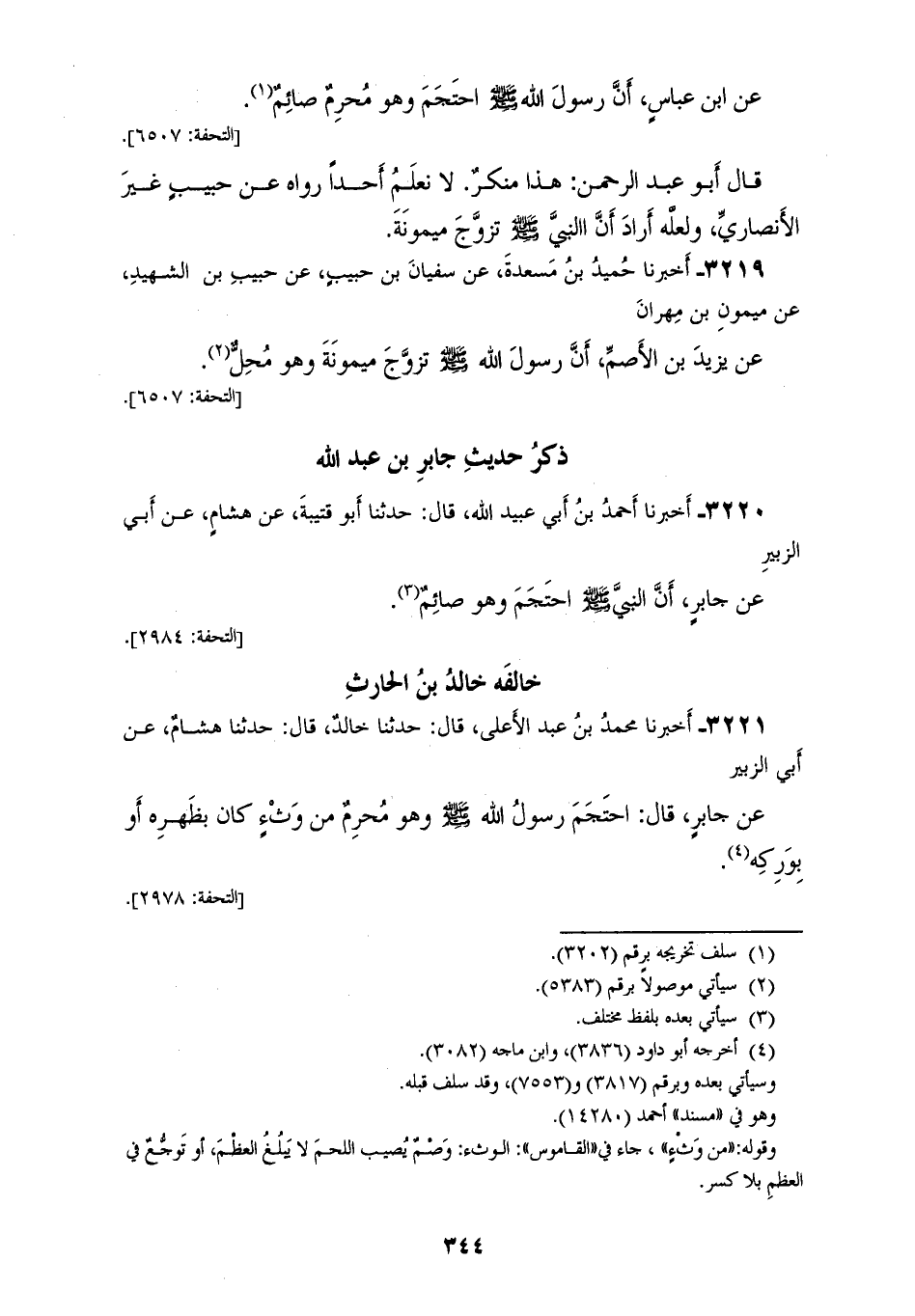 3218 - أَخْبَرَنَا مُحَمَّدُ بْنُ الْمُثَنَّى، قَالَ: حَدَّثَنَا مُحَمَّدُ بْنُ عَبْدِ اللهِ، قَالَ: حَدَّثَنَا حَبِيبُ بْنُ الشَّهِيدِ، عَنْ مَيْمُونِ بْنِ مِهْرَانَ، عَنِ ابْنِ عَبَّاسٍ، أَنَّ رَسُولَ اللهِ صَلَّى اللهُ عَلَيْهِ وَسَلَّمَ «§احْتَجَمَ وَهُوَ مُحْرِمٌ صَائِمٌ» قَالَ أَبُو عَبْدِ الرَّحْمَنِ: هَذَا مُنْكَرٌ، لَا نَعْلَمُ أَحَدًا رَوَاهُ عَنْ حَبِيبٍ غَيْرَ الْأَنْصَارِيِّ، وَلَعَلَّهُ أَرَادَ أَنَّ النَّبِيَّ صَلَّى اللهُ عَلَيْهِ وَسَلَّمَ «تَزَوَّجَ مَيْمُونَةَ»