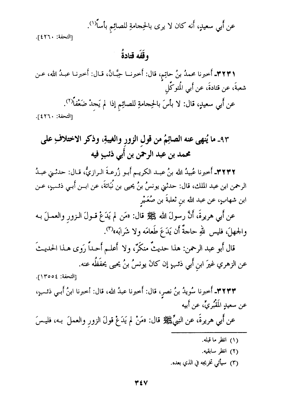 3233 - أَخْبَرَنَا سُوَيْدُ بْنُ نَصْرٍ قَالَ: أَخْبَرَنَا عَبْدُ اللهِ قَالَ: أَخْبَرَنَا ابْنُ أَبِي ذِئْبٍ، عَنْ سَعِيدٍ الْمَقْبُرِيِّ، عَنْ أَبِيهِ، عَنْ أَبِي هُرَيْرَةَ، عَنِ النَّبِيِّ صَلَّى اللهُ عَلَيْهِ وَسَلَّمَ قَالَ: «§مَنْ لَمْ يَدَعْ قَوْلَ الزُّورِ وَالْعَمَلَ بِهِ فَلَيْسَ لِلَّهِ حَاجَةٌ بِأَنْ يَدَعَ طَعَامَهُ وَشَرَابَهُ»