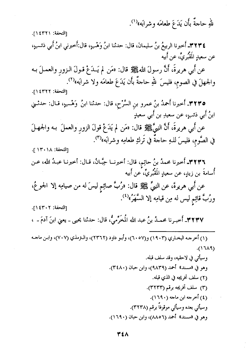 3234 - أَخْبَرَنَا الرَّبِيعُ بْنُ سُلَيْمَانَ قَالَ: حَدَّثَنَا ابْنُ وَهْبٍ قَالَ: أَخْبَرَنِي ابْنُ أَبِي ذِئْبٍ، عَنْ سَعِيدٍ الْمَقْبُرِيِّ، عَنْ أَبِيهِ، عَنْ أَبِي هُرَيْرَةَ، أَنَّ رَسُولَ اللهِ صَلَّى اللهُ عَلَيْهِ وَسَلَّمَ قَالَ: «§مَنْ لَمْ يَدَعْ قَوْلَ الزُّورِ وَالْعَمَلَ بِهِ وَالْجَهْلَ فِي الصَّوْمِ فَلَيْسَ لِلَّهِ حَاجَةٌ بِأَنْ يَدَعَ طَعَامَهُ وَلَا شَرَابَهُ»