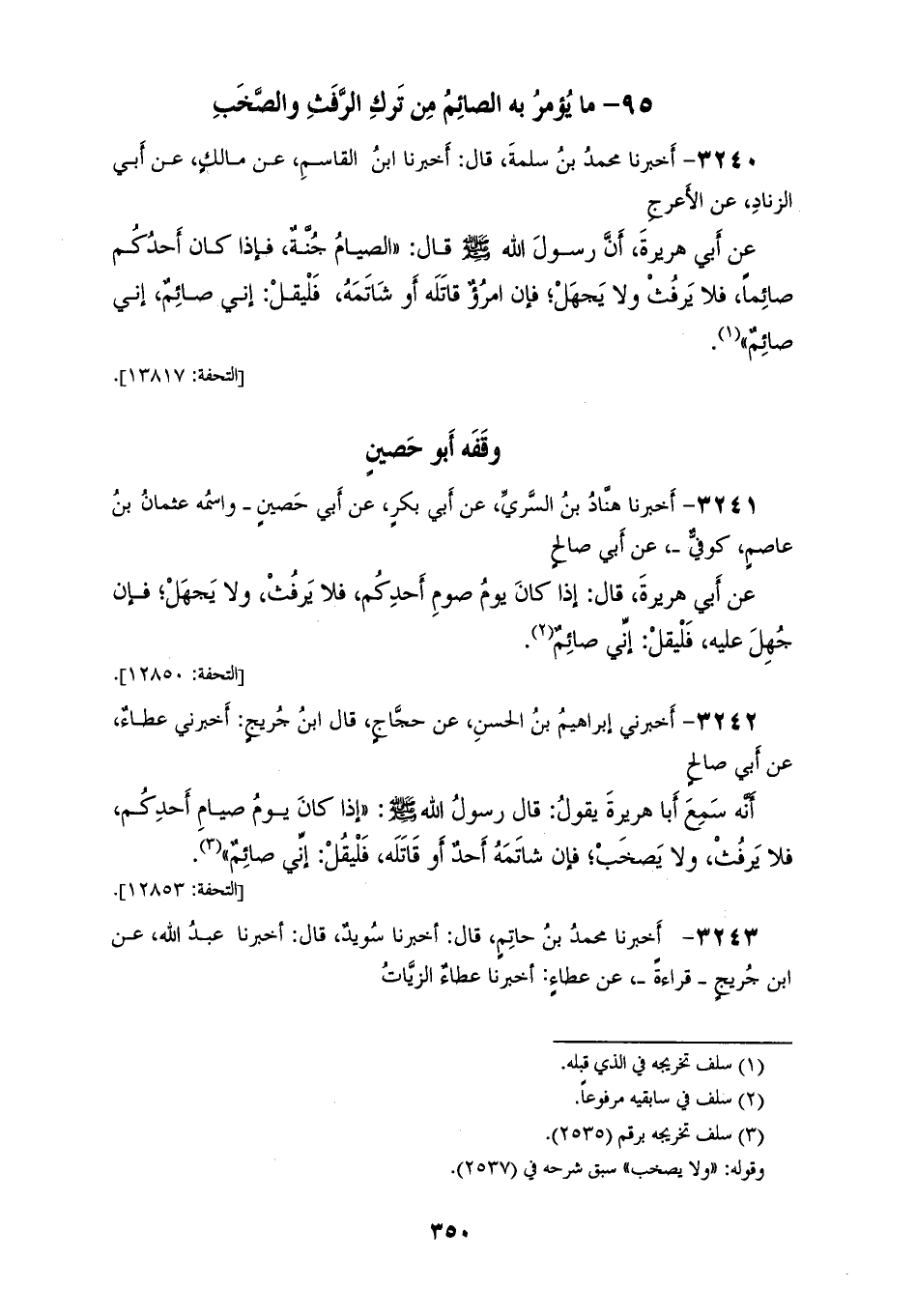 3241 - أَخْبَرَنَا هَنَّادُ بْنُ السَّرِيِّ، عَنْ أَبِي بَكْرٍ، عَنْ أَبِي حَصِينٍ، وَاسْمُهُ، عُثْمَانُ بْنُ عَاصِمٍ كُوفِيٌّ عَنْ أَبِي صَالِحٍ، عَنْ أَبِي هُرَيْرَةَ قَالَ: «§إِذَا كَانَ يَوْمُ صَوْمِ أَحَدِكُمْ فَلَا يَرْفُثْ وَلَا يَجْهَلْ، فَإِنْ جُهِلَ عَلَيْهِ فَلْيَقُلْ إِنِّي صَائِمٌ»