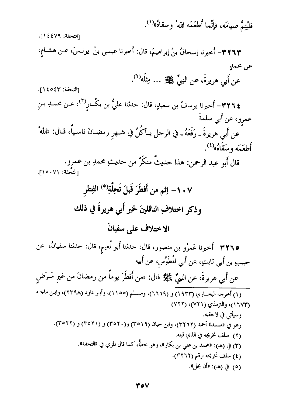 3264 - أَخْبَرَنَا يُوسُفُ بْنُ سَعِيدٍ قَالَ: حَدَّثَنَا عَلِيُّ بْنُ بَكَّارٍ، عَنْ مُحَمَّدِ بْنِ عَمْرٍو، عَنْ أَبِي سَلَمَةَ، عَنْ أَبِي هُرَيْرَةَ، رَفَعَهُ فِي الرَّجُلِ يَأْكُلُ فِي شَهْرِ رَمَضَانَ نَاسِيًا قَالَ: «§اللهُ أَطْعَمُهُ وَسَقَاهُ» قَالَ: أَبُو عَبْدِ الرَّحْمَنِ: هَذَا حَدِيثٌ مُنْكَرٌ مِنْ حَدِيثِ مُحَمَّدِ بْنِ عَمْرٍو