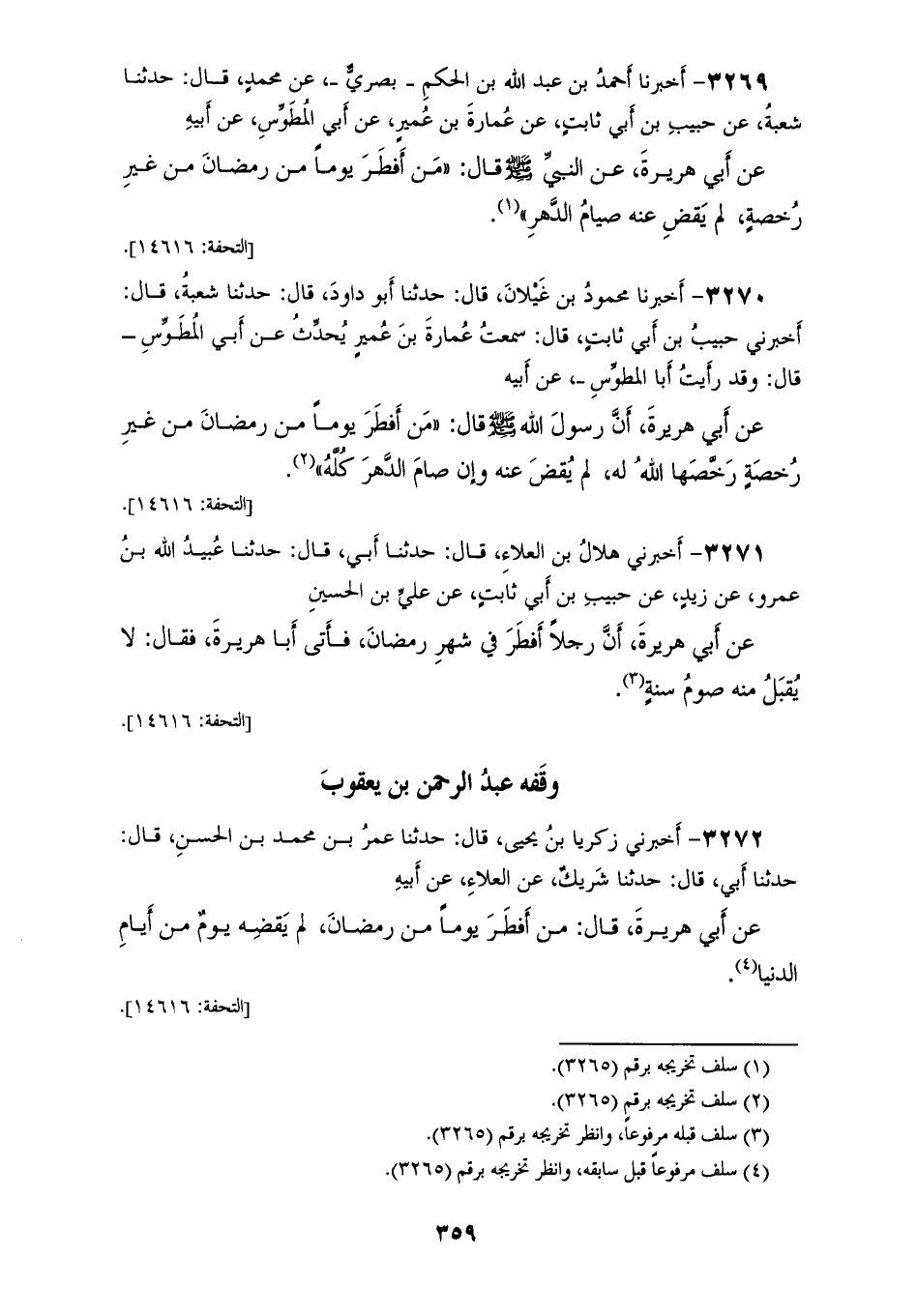 3271 - أَخْبَرَنِي هِلَالُ بْنُ الْعَلَاءِ قَالَ: حَدَّثَنَا أَبِي قَالَ: حَدَّثَنَا عُبَيْدُ اللهِ بْنُ عَمْرٍو، عَنْ زَيْدٍ، عَنْ حَبِيبِ بْنِ أَبِي ثَابِتٍ، عَنْ عَلِيِّ بْنِ الْحُسَيْنِ، عَنْ أَبِي هُرَيْرَةَ، أَنَّ رَجُلًا أَفْطَرَ فِي شَهْرِ رَمَضَانَ فَأَتَى أَبَا هُرَيْرَةَ فَقَالَ: «§لَا يُقْبَلُ مِنْهُ صَوْمُ سَنَةٍ». وَقَفَهُ عَبْدُ الرَّحْمَنِ بْنُ يَعْقُوبَ