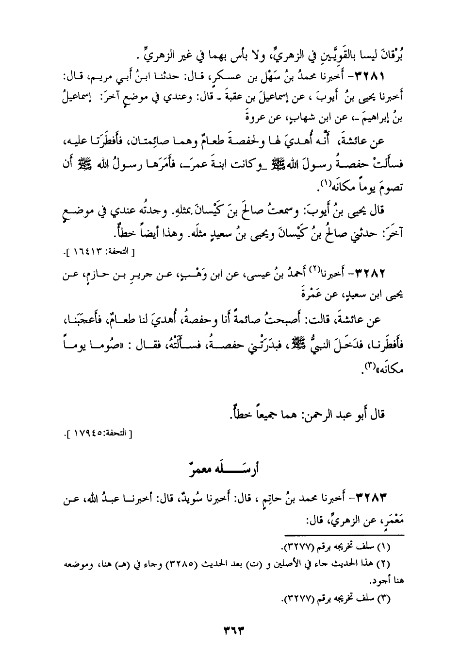 3281 - أَخْبَرَنَا مُحَمَّدُ بْنُ سَهْلِ بْنِ عَسْكَرٍ قَالَ: حَدَّثَنَا ابْنُ أَبِي مَرْيَمَ قَالَ: أَخْبَرَنَا يَحْيَى بْنُ أَيُّوبَ، عَنْ إِسْمَاعِيلَ بْنِ عُقْبَةَ قَالَ: وَعِنْدِي فِي مَوْضِعٍ آخَرَ إِسْمَاعِيلُ بْنُ إِبْرَاهِيمَ، عَنِ ابْنِ شِهَابٍ، عَنْ عُرْوَةَ، عَنْ عَائِشَةَ أَنَّهُ أُهْدِيَ لَهَا وَلِحَفْصَةَ طَعَامٌ، وَهُمَا صَائِمَتَانِ فَأَفْطَرَتَا عَلَيْهِ، فَسَأَلَتْ حَفْصَةُ رَسُولَ اللهِ صَلَّى اللهُ عَلَيْهِ وَسَلَّمَ وَكَانَتِ ابْنَةَ عُمَرَ، فَأَمَرَهَا رَسُولُ اللهِ صَلَّى اللهُ عَلَيْهِ وَسَلَّمَ «§أَنْ تَصُومَ يَوْمًا مَكَانَهُ» قَالَ يَحْيَى بْنُ أَيُّوبَ وَسَمِعْتُ صَالِحَ بْنَ كَيْسَانَ، بِمِثْلِهِ وَجَدْتُهُ عِنْدِي فِي مَوْضِعٍ آخَرَ حَدَّثَنِي صَالِحُ بْنُ كَيْسَانَ، وَيَحْيَى بْنُ سَعِيدٍ مِثْلَهُ وَهَذَا أَيْضًا خَطَأٌ