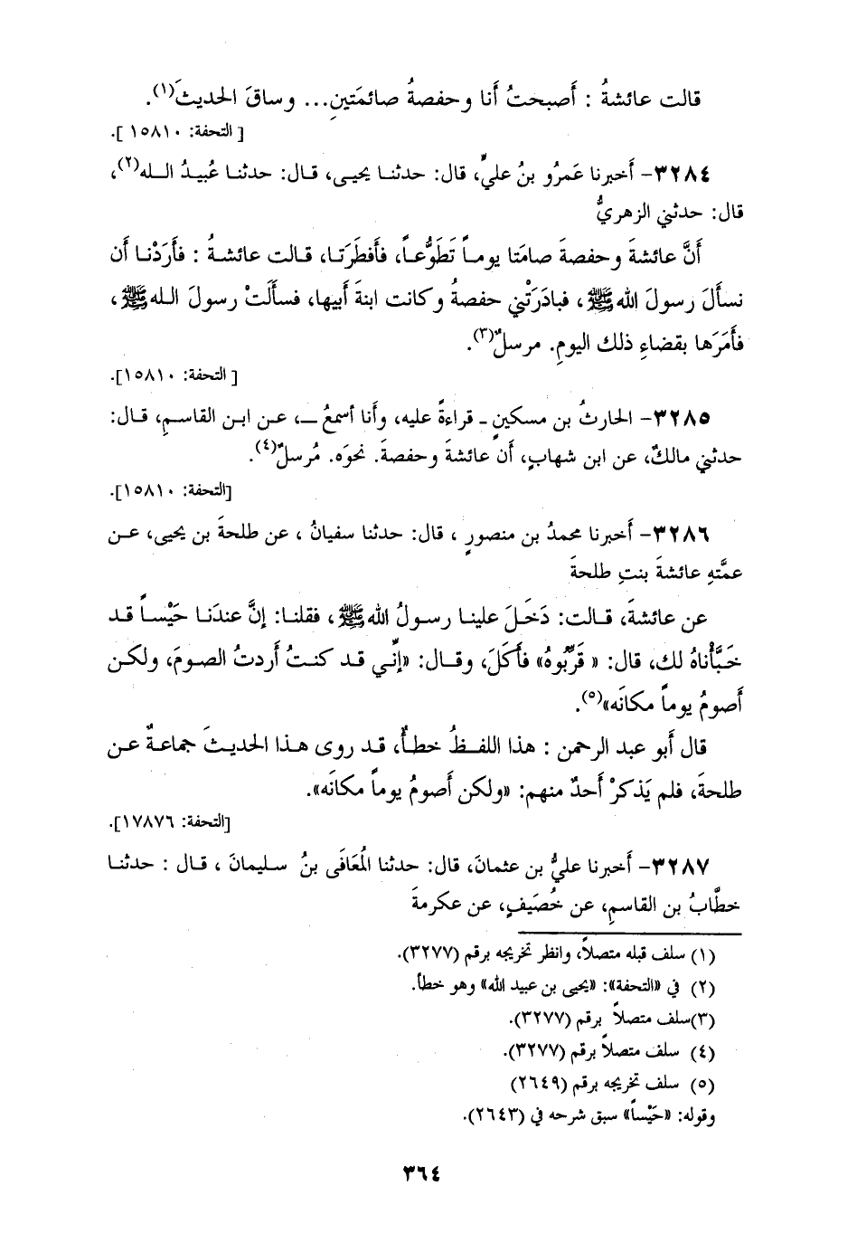 3286 - أَخْبَرَنَا مُحَمَّدُ بْنُ مَنْصُورٍ قَالَ: حَدَّثَنَا سُفْيَانُ، عَنْ طَلْحَةَ بْنِ يَحْيَى، عَنْ عَمَّتِهِ، عَائِشَةَ بِنْتِ طَلْحَةَ، عَنْ عَائِشَةَ قَالَتْ: دَخَلَ عَلَيْنَا رَسُولُ اللهِ صَلَّى اللهُ عَلَيْهِ وَسَلَّمَ فَقُلْنَا: إِنَّ عِنْدَنَا حَيْسًا قَدْ خَبَأْنَاهُ لَكَ قَالَ: «قَرِّبُوهُ» فَأَكَلَ، وَقَالَ: «§إِنِّي قَدْ كُنْتُ أَرَدْتُ الصَّوْمَ وَلَكِنْ أَصُومُ يَوْمًا مَكَانَهُ» قَالَ أَبُو عَبْدِ الرَّحْمَنِ: هَذَا اللَّفْظُ خَطَأٌ، قَدْ رَوَى هَذَا الْحَدِيثَ جَمَاعَةٌ عَنْ طَلْحَةَ فَلَمْ يَذْكُرْ أَحَدٌ مِنْهُمْ «وَلَكِنْ أَصُومُ يَوْمًا مَكَانَهُ»