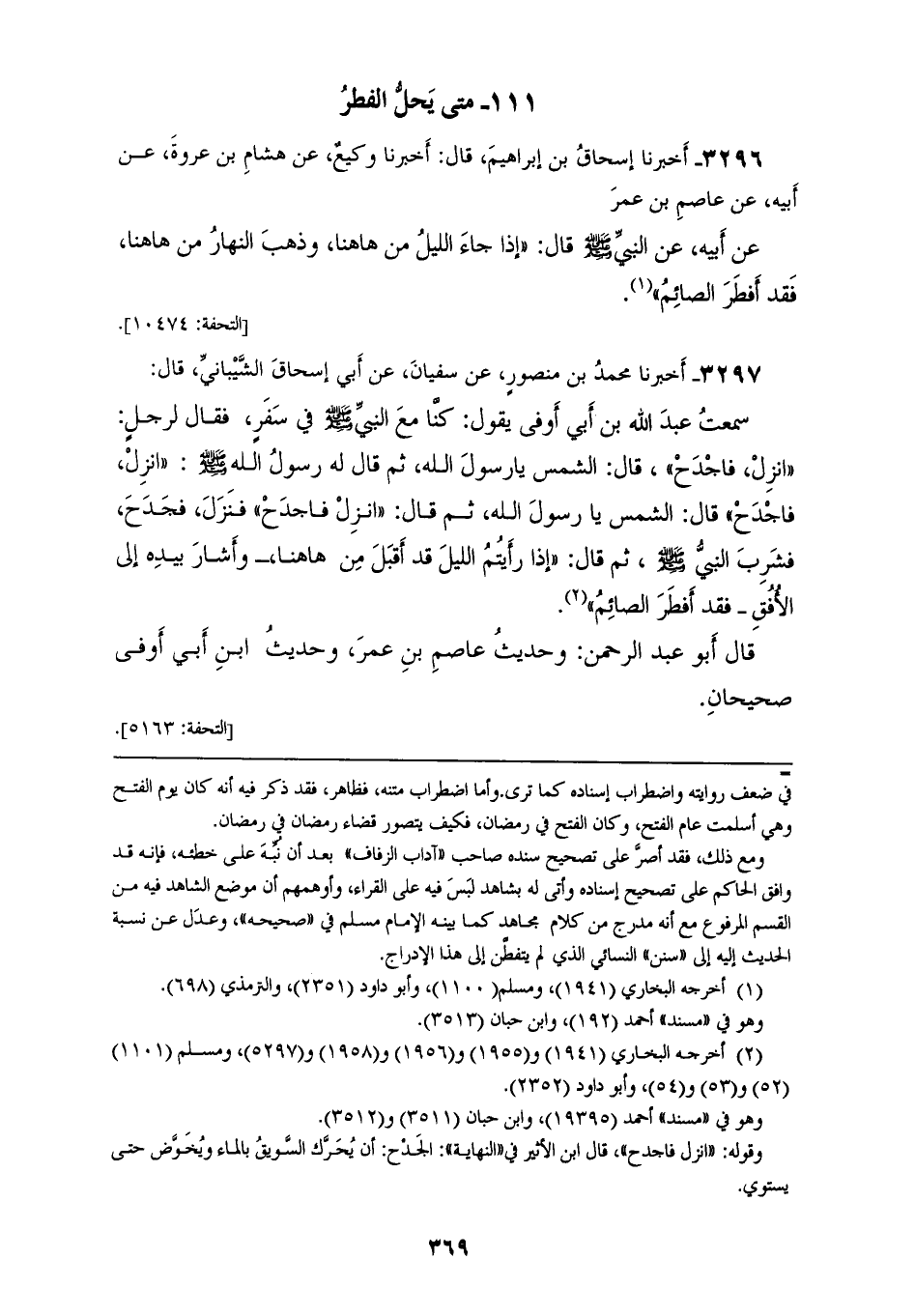 3297 - أَخْبَرَنَا مُحَمَّدُ بْنُ مَنْصُورٍ، عَنْ سُفْيَانَ، عَنْ أَبِي إِسْحَاقَ الشَّيْبَانِيِّ قَالَ: سَمِعْتُ عَبْدَ اللهِ بْنَ أَبِي أَوْفَى، يَقُولُ: كُنَّا مَعَ النَّبِيِّ صَلَّى اللهُ عَلَيْهِ وَسَلَّمَ فِي سَفَرٍ، فَقَالَ لِرَجُلٍ: «انْزِلْ فَاجْدَحْ» قَالَ: الشَّمْسُ يَا رَسُولَ اللهِ، ثُمَّ قَالَ لَهُ رَسُولُ اللهِ صَلَّى اللهُ عَلَيْهِ وَسَلَّمَ: «انْزِلْ فَاجْدَحْ» قَالَ: الشَّمْسُ يَا رَسُولَ اللهِ، ثُمَّ قَالَ: «انْزِلْ فَاجْدَحْ» فَنَزَلَ فَجَدَحَ فَشَرِبَ النَّبِيُّ صَلَّى اللهُ عَلَيْهِ وَسَلَّمَ ثُمَّ قَالَ: «§إِذَا رَأَيْتُمُ اللَّيْلَ قَدْ أَقْبَلَ مِنْ هَاهُنَا - وَأَشَارَ بِيَدِهِ إِلَى الْأُفُقِ - فَقَدْ أَفْطَرَ الصَّائِمُ» قَالَ أَبُو عَبْدِ الرَّحْمَنِ: وَحَدِيثُ عَاصِمِ بْنِ عُمَرَ وَحَدِيثُ ابْنِ أَبِي أَوْفَى صَحِيحَانِ