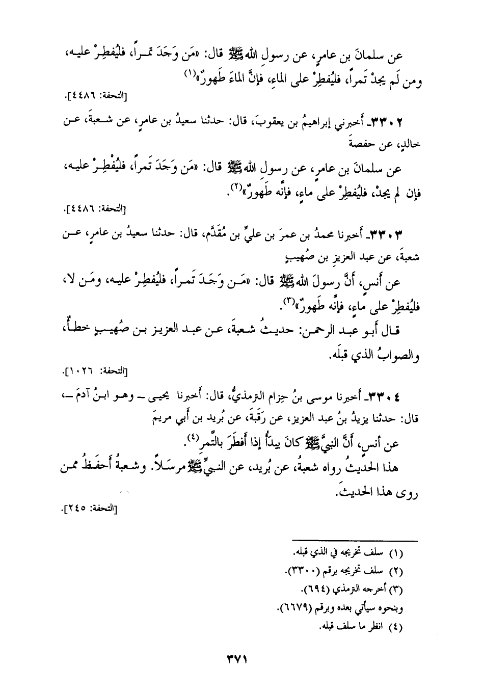 3303 - أَخْبَرَنَا مُحَمَّدُ بْنُ عُمَرَ بْنِ عَلِيِّ بْنِ مُقَدَّمٍ قَالَ: حَدَّثَنَا سَعِيدُ بْنُ عَامِرٍ، عَنْ شُعْبَةَ، عَنْ عَبْدِ الْعَزِيزِ بْنِ صُهَيْبٍ، عَنْ أَنَسٍ، أَنَّ رَسُولَ اللهِ صَلَّى اللهُ عَلَيْهِ وَسَلَّمَ قَالَ: «§مَنْ وَجَدَ تَمْرًا فَلْيُفْطِرْ عَلَيْهِ، وَمَنْ لَا فَلْيُفْطِرْ عَلَى مَاءٍ فَإِنَّهُ طَهُورٌ». قَالَ أَبُو عَبْدِ الرَّحْمَنِ: حَدِيثُ شُعْبَةَ عَنْ عَبْدِ الْعَزِيزِ بْنِ صُهَيْبٍ خَطَأٌ، وَالصَّوَابُ الَّذِي قَبْلَهُ