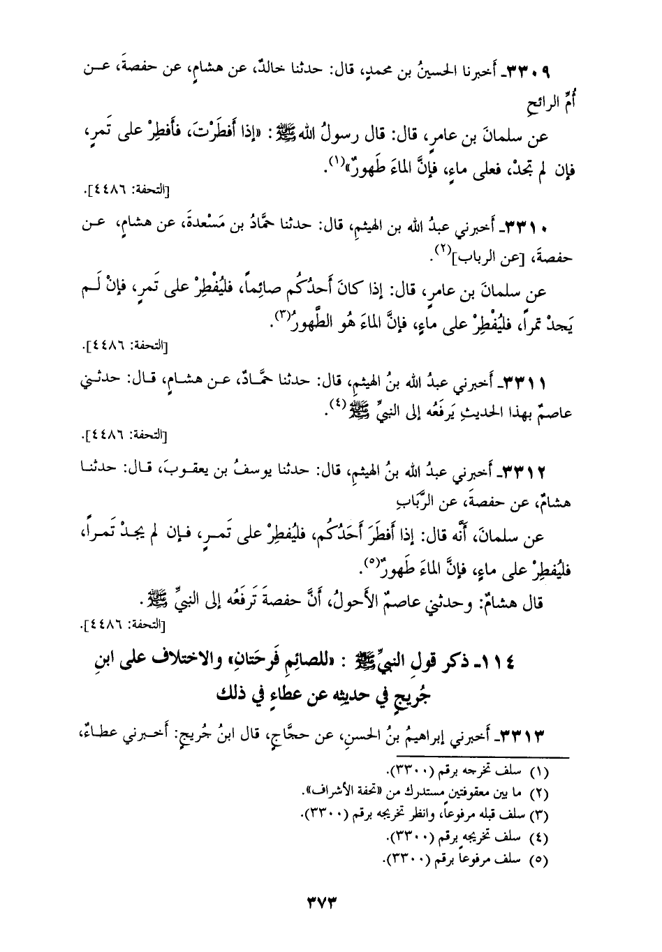 3309 - أَخْبَرَنَا الْحُسَيْنُ بْنُ مُحَمَّدٍ قَالَ: حَدَّثَنَا خَالِدٌ، عَنْ هِشَامٍ، عَنْ حَفْصَةَ، عَنْ أُمِّ الرَّائِحِ، عَنْ سَلْمَانَ بْنِ عَامِرٍ قَالَ: قَالَ رَسُولُ اللهِ صَلَّى اللهُ عَلَيْهِ وَسَلَّمَ: «§إِذَا أَفْطَرْتَ فَأَفْطِرْ عَلَى تَمْرٍ فَإِنْ لَمْ تَجِدْ فَعَلَى مَاءٍ فَإِنَّ الْمَاءَ طَهُورٌ»