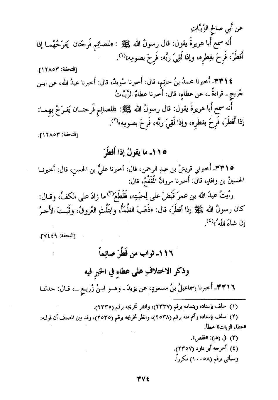 3314 - أَخْبَرَنَا مُحَمَّدُ بْنُ حَاتِمٍ قَالَ: أَخْبَرَنَا سُوَيْدٌ قَالَ: أَخْبَرَنَا عَبْدُ اللهِ، عَنِ ابْنِ جُرَيْجٍ، قِرَاءَةً عَنْ عَطَاءٍ قَالَ: أَخْبَرَنَا عَطَاءٌ الزَّيَّاتُ، أَنَّهُ سَمِعَ أَبَا هُرَيْرَةَ يَقُولُ: قَالَ رَسُولُ اللهِ صَلَّى اللهُ عَلَيْهِ وَسَلَّمَ: " §لِلصَّائِمِ فَرْحَتَانِ يُفْرَحُ بِهِمَا: إِذَا أَفْطَرَ فَرِحَ بِفِطْرِهِ، وَإِذَا لَقِيَ رَبَّهُ فَرِحَ بِصَوْمِهِ "