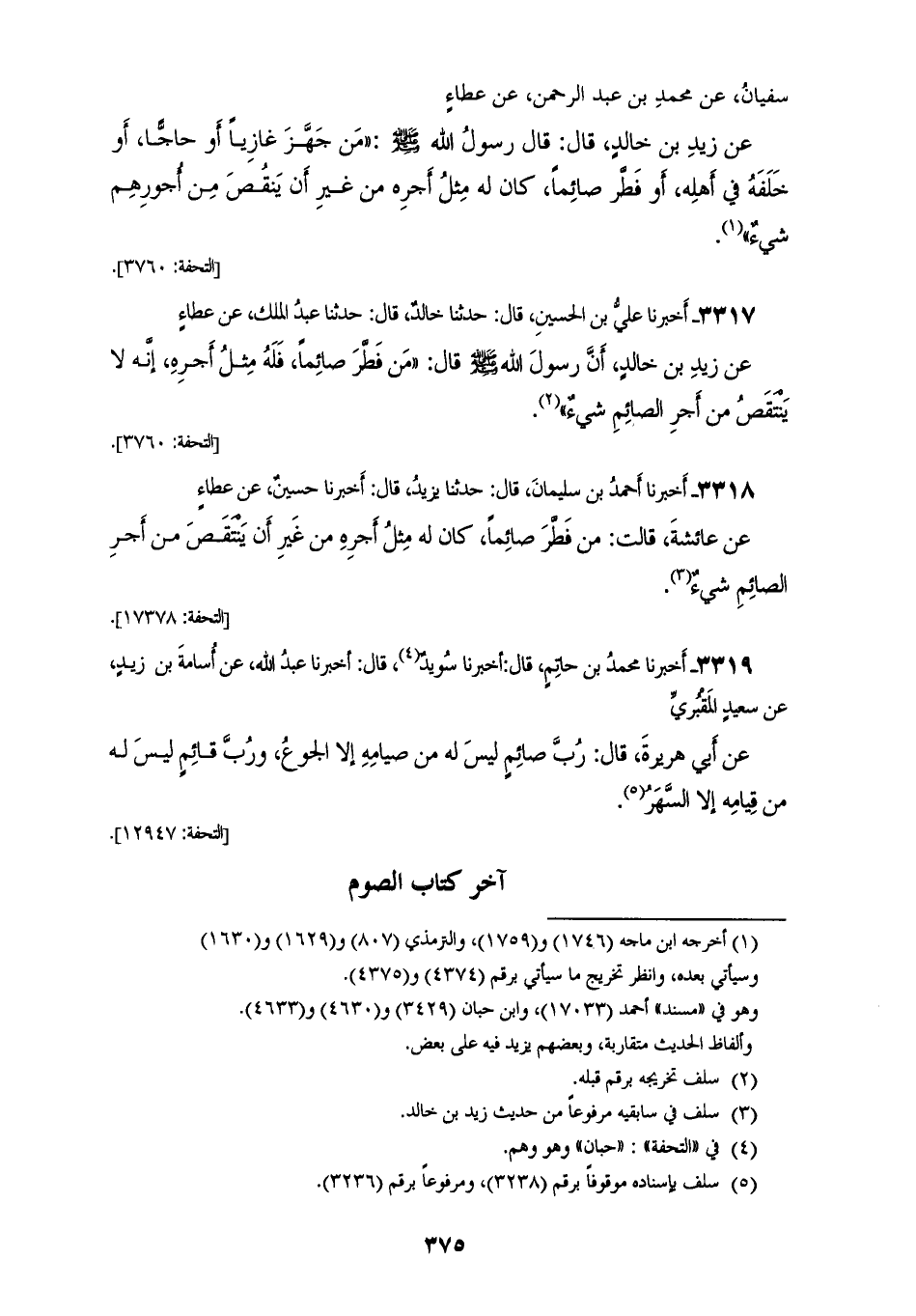 3317 - أَخْبَرَنَا عَلِيُّ بْنُ الْحُسَيْنِ قَالَ: حَدَّثَنَا خَالِدٌ قَالَ: حَدَّثَنَا عَبْدُ الْمَلِكِ، عَنْ عَطَاءٍ، عَنْ زَيْدِ بْنِ خَالِدٍ، أَنَّ رَسُولَ اللهِ صَلَّى اللهُ عَلَيْهِ وَسَلَّمَ قَالَ: «§مَنْ فَطَّرَ صَائِمًا فَلَهُ مِثْلُ أَجْرُهُ، إِنَّهُ لَا يَنْتَقِصُ مِنْ أَجْرِ الصَّائِمِ شَيْءٌ»