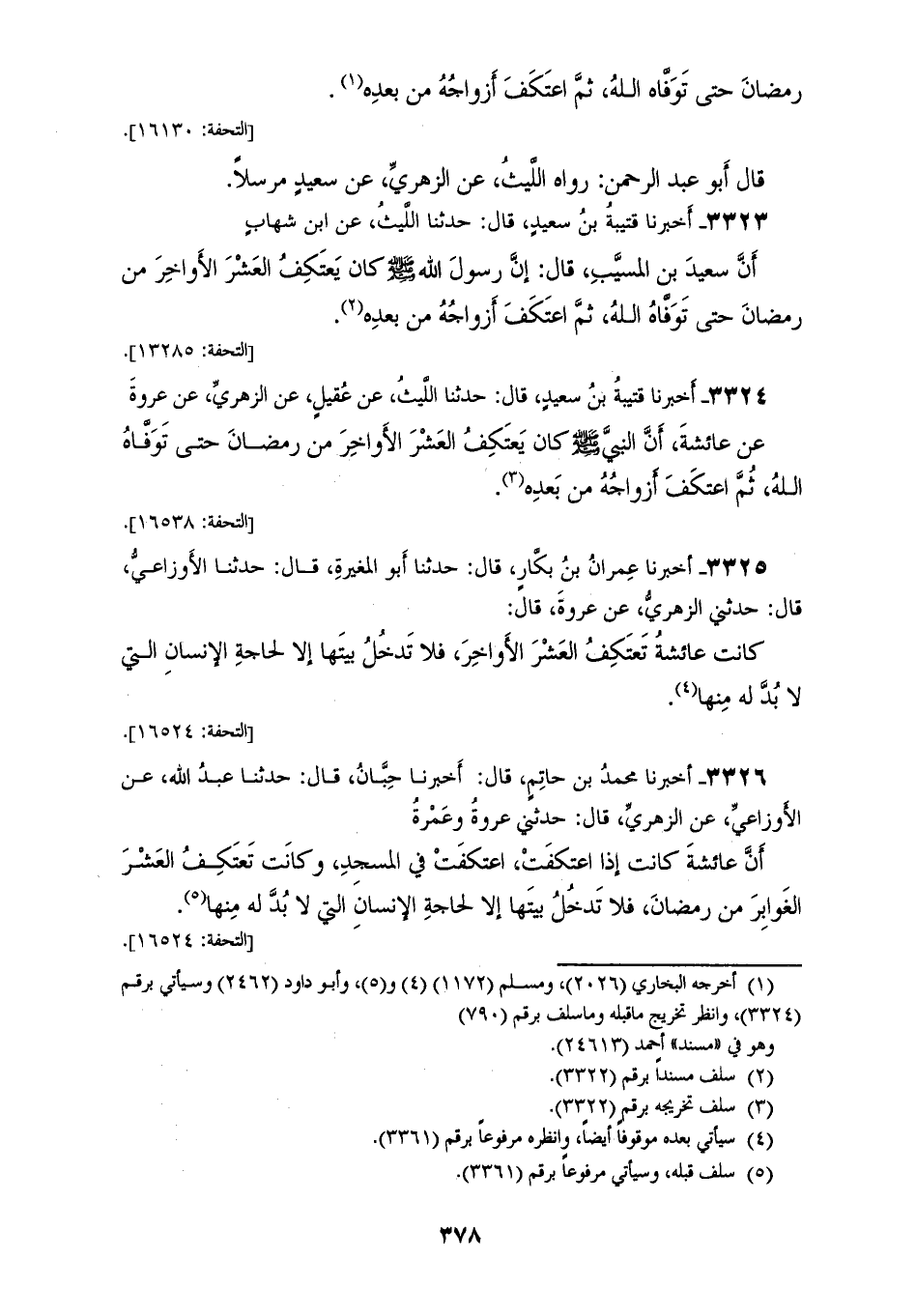 3325 - أَخْبَرَنَا عِمْرَانُ بْنُ بَكَّارٍ قَالَ: حَدَّثَنَا أَبُو الْمُغِيرَةِ قَالَ: حَدَّثَنَا الْأَوْزَاعِيُّ قَالَ: حَدَّثَنِي الزُّهْرِيُّ، عَنْ عُرْوَةَ قَالَ: كَانَتْ عَائِشَةُ «§تَعْتَكِفُ الْعَشْرَ الْأَوَاخِرَ فَلَا تَدْخُلُ بَيْتِهَا إِلَّا لِحَاجَةِ الْإِنْسَانِ الَّتِي لَا بُدَّ لَهُ مِنْهَا»