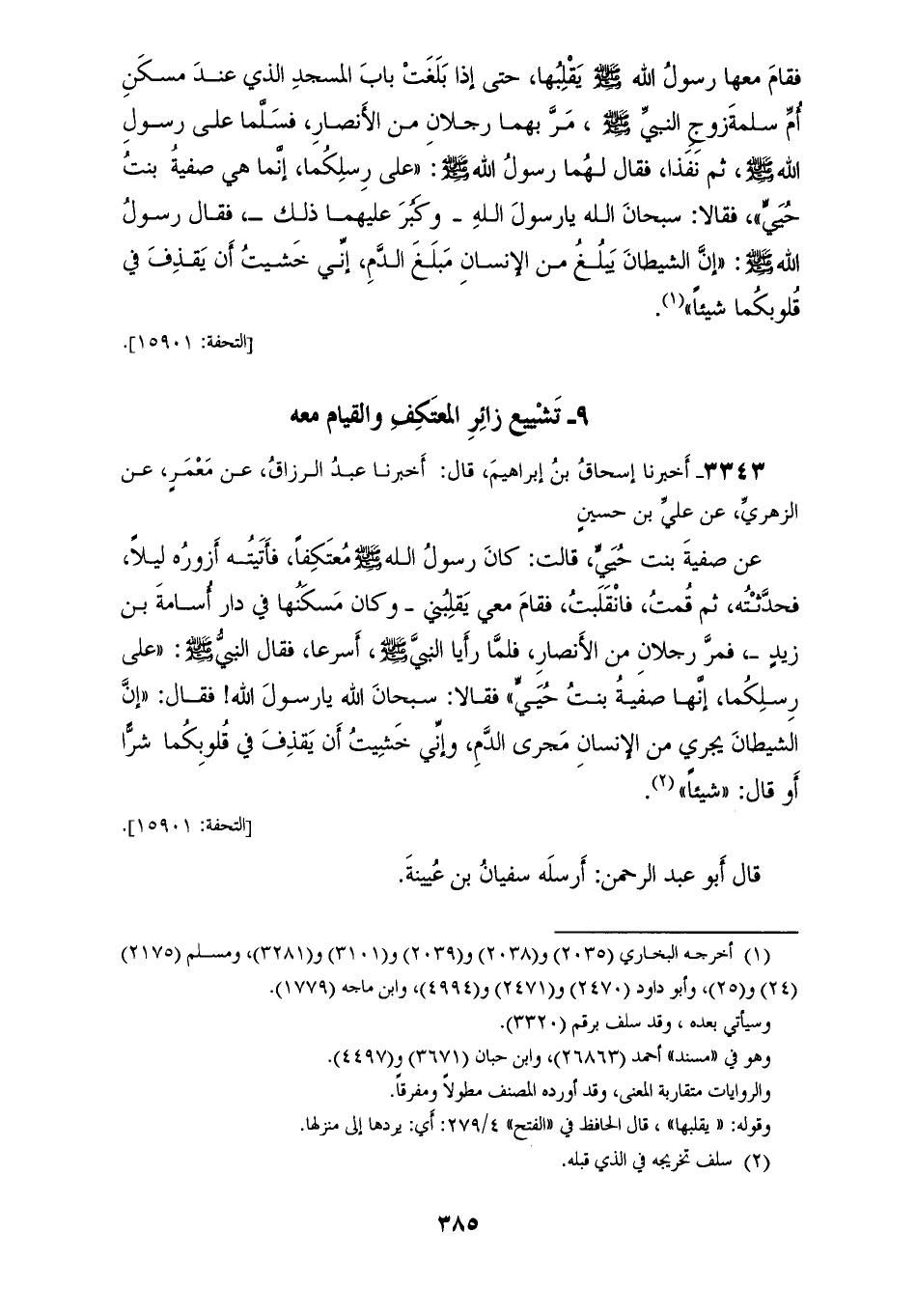 3343 - أَخْبَرَنَا إِسْحَاقُ بْنُ إِبْرَاهِيمَ قَالَ: أَخْبَرَنَا عَبْدُ الرَّزَّاقِ، عَنْ مَعْمَرٍ، عَنِ الزُّهْرِيِّ، عَنْ عَلِيِّ بْنِ حُسَيْنٍ، عَنْ صَفِيَّةَ بِنْتِ حُيَيٍّ، قَالَتْ: كَانَ رَسُولُ اللهِ صَلَّى اللهُ عَلَيْهِ وَسَلَّمَ مُعْتَكِفًا فَأَتَيْتُهُ أَزُورُهُ لَيْلًا فَحَدَّثْتُهُ، ثُمَّ قُمْتُ فَانْقَلَبْتُ، فَقَامَ مَعِي يَقْلِبُنِي، وَكَانَ مَسْكَنُهَا فِي دَارِ أُسَامَةَ بْنِ زَيْدٍ، فَمَرَّ رَجُلَانِ مِنَ الْأَنْصَارِ، فَلَمَّا رَأَيَا النَّبِيَّ صَلَّى اللهُ عَلَيْهِ وَسَلَّمَ أَسْرَعَا فَقَالَ النَّبِيُّ صَلَّى اللهُ عَلَيْهِ وَسَلَّمَ: «عَلَى رِسْلِكُمَا، إِنَّهَا صَفِيَّةُ بِنْتُ حُيَيٍّ» فَقَالَا: سُبْحَانَ اللهِ يَا رَسُولَ اللهِ، فَقَالَ: «§إِنَّ الشَّيْطَانَ يَجْرِي مِنَ الْإِنْسَانِ مَجْرَى الدَّمِ، وَإِنِّي خَشِيتُ أَنَّ يِقْذِفَ فِي قُلُوبِكُمَا شَرًّا أَوْ قَالَ شَيْئًا» قَالَ أَبُو عَبْدِ الرَّحْمَنِ: أَرْسَلَهُ سُفْيَانُ بْنُ عُيَيْنَةَ