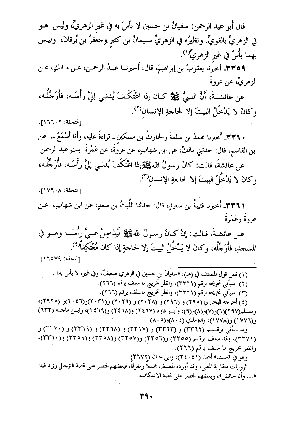 3359 - أَخْبَرَنَا يَعْقُوبُ بْنُ إِبْرَاهِيمَ قَالَ: أَخْبَرَنَا عَبْدُ الرَّحْمَنِ، عَنْ مَالِكٍ، عَنِ الزُّهْرِيِّ، عَنْ عُرْوَةَ، عَنْ عَائِشَةَ، أَنَّ النَّبِيَّ صَلَّى اللهُ عَلَيْهِ وَسَلَّمَ كَانَ «§إِذَا اعْتَكَفَ يُدْنِي إِلَيَّ رَأْسَهُ فَأُرَجِّلُهُ، وَكَانَ لَا يَدْخُلُ الْبَيْتَ إِلَّا لِحَاجَةِ الْإِنْسَانِ»