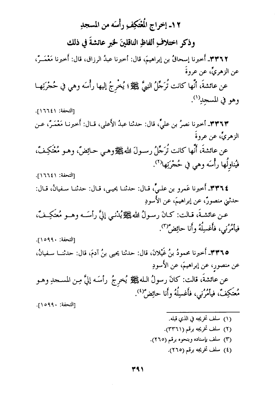3365 - أَخْبَرَنَا مَحْمُودُ بْنُ غَيْلَانَ قَالَ: حَدَّثَنَا يَحْيَى بْنُ آدَمَ قَالَ: حَدَّثَنَا سُفْيَانُ، عَنْ مَنْصُورٍ، عَنْ إِبْرَاهِيمَ، عَنِ الْأَسْوَدِ، عَنْ عَائِشَةَ، قَالَتْ: كَانَ رَسُولُ اللهِ صَلَّى اللهُ عَلَيْهِ وَسَلَّمَ «§يُخْرِجُ رَأْسَهُ إِلَيَّ مِنَ الْمَسْجِدِ وَهُوَ مُعْتَكِفٌ فَيَأْمُرُنِي فَأَغْسِلُهُ وَأَنَا حَائِضٌ»