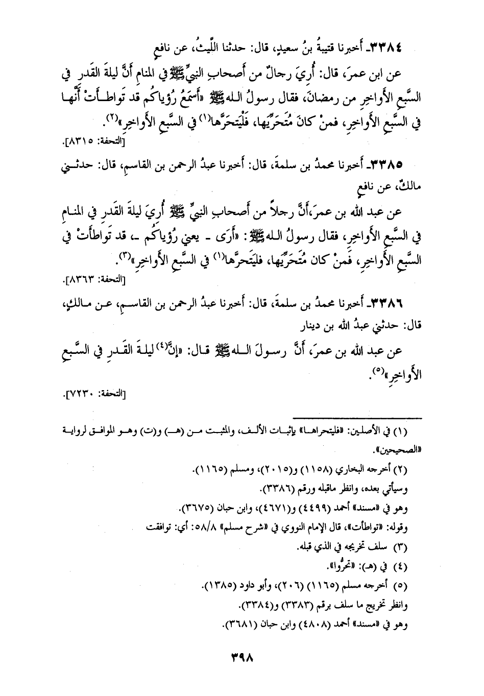 3384 - أَخْبَرَنَا قُتَيْبَةُ بْنُ سَعِيدٍ قَالَ: حَدَّثَنَا اللَّيْثُ، عَنْ نَافِعٍ، عَنِ ابْنِ عُمَرَ قَالَ: أُرِيَ رِجَالٌ مِنْ أَصْحَابِ النَّبِيِّ صَلَّى اللهُ عَلَيْهِ وَسَلَّمَ فِي الْمَنَامِ أَنَّ لَيْلَةَ الْقَدْرِ فِي السَّبْعِ الْأَوَاخِرِ مِنْ رَمَضَانَ فَقَالَ رَسُولُ اللهِ صَلَّى اللهُ عَلَيْهِ وَسَلَّمَ: «§أَسْمَعُ رُؤْيَاكُمْ قَدْ تَوَاطَأَتْ أَنَّهَا فِي السَّبْعِ الْأَوَاخِرِ، فَمَنْ كَانَ مُتَحَرِّيَهَا فَلْيَتَحَرَّهَا فِي السَّبْعِ الْأَوَاخِرِ»