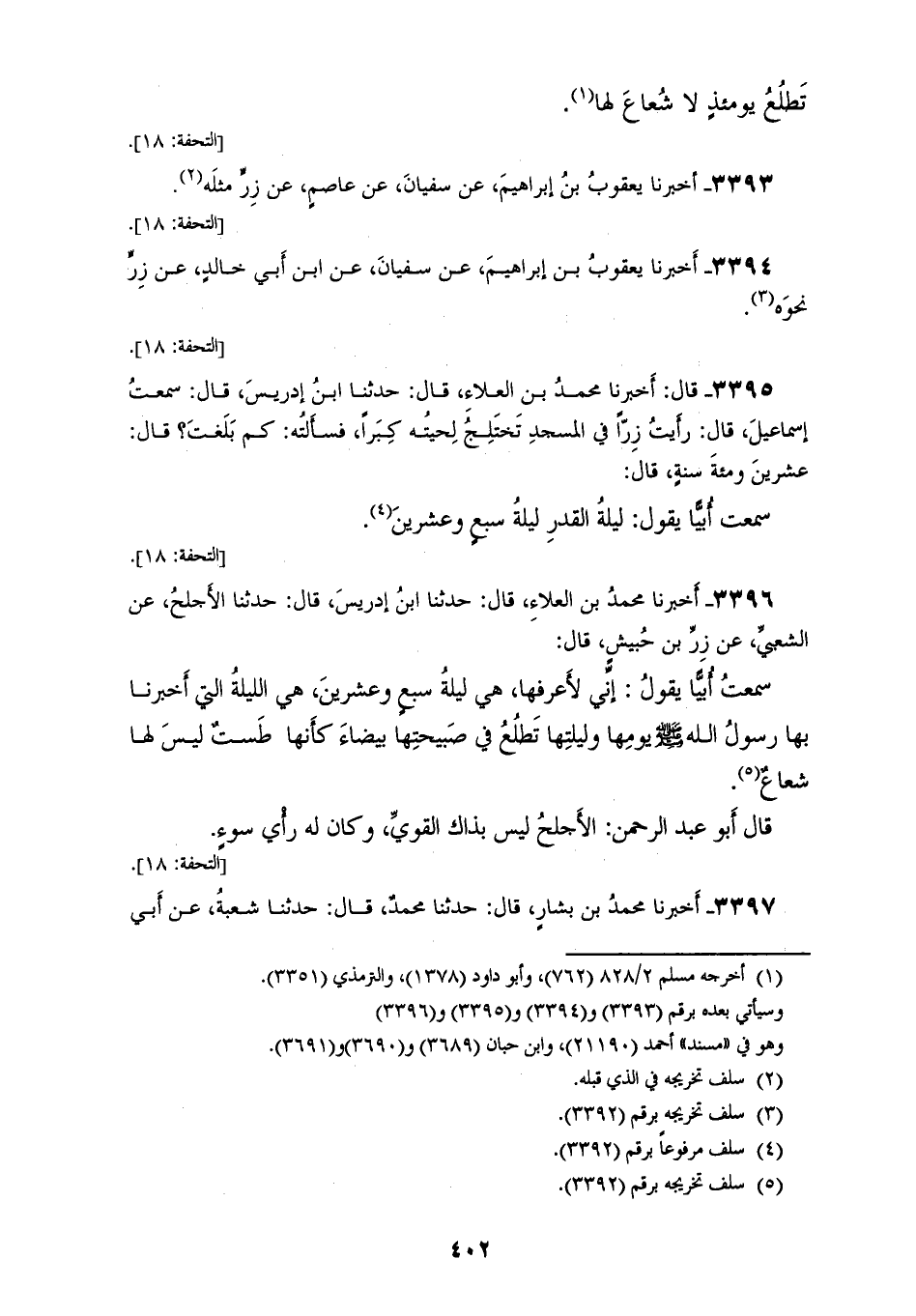3396 - أَخْبَرَنَا مُحَمَّدُ بْنُ الْعَلَاءِ قَالَ: حَدَّثَنَا ابْنُ إِدْرِيسَ قَالَ: حَدَّثَنَا الْأَجْلَحُ، عَنِ الشَّعْبِيِّ، عَنْ زِرِّ بْنِ حُبَيْشٍ قَالَ: سَمِعْتُ أُبَيًّا، يَقُولُ: «§إِنِّي لَأَعْرِفُهَا هِي لَيْلَةُ سَبْعٍ وَعِشْرِينَ، هِي اللَّيْلَةُ الَّتِي أَخْبَرَنَا بِهَا رَسُولُ اللهِ صَلَّى اللهُ عَلَيْهِ وَسَلَّمَ يَوْمَهَا وَلَيْلَتَهَا تَطْلُعُ فِي صَبِيحَتِهَا بَيْضَاءَ كَأَنَّهَا طَسْتٌ لَيْسَ لَهَا شُعَاعٌ»، قَالَ أَبُو عَبْدِ الرَّحْمَنِ: الْأَجْلَحُ لَيْسَ بِذَلِكَ الْقَوِيِّ وكان له رأي سوءٍ
